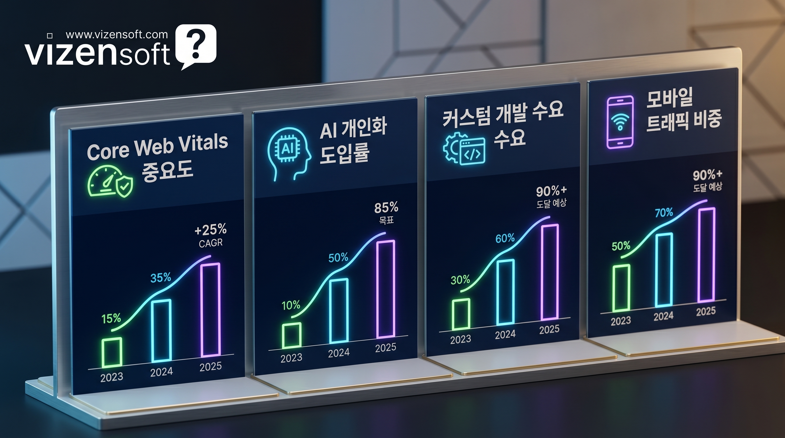 홈페이지 제작 업계는 빠르게 변화하고 있습니다. 과거에는 "예쁘게 만드는 것"이 핵심이었다면, 지금은 "성과를 내는 홈페이지" 가 핵심 화두입니다. 최근 트렌드를 파악하면, 가격 결정뿐 아니라 어떤 기능과 전략을 우선순위로 두어야 하는지 판단하는 데 큰 도움이 됩니다.