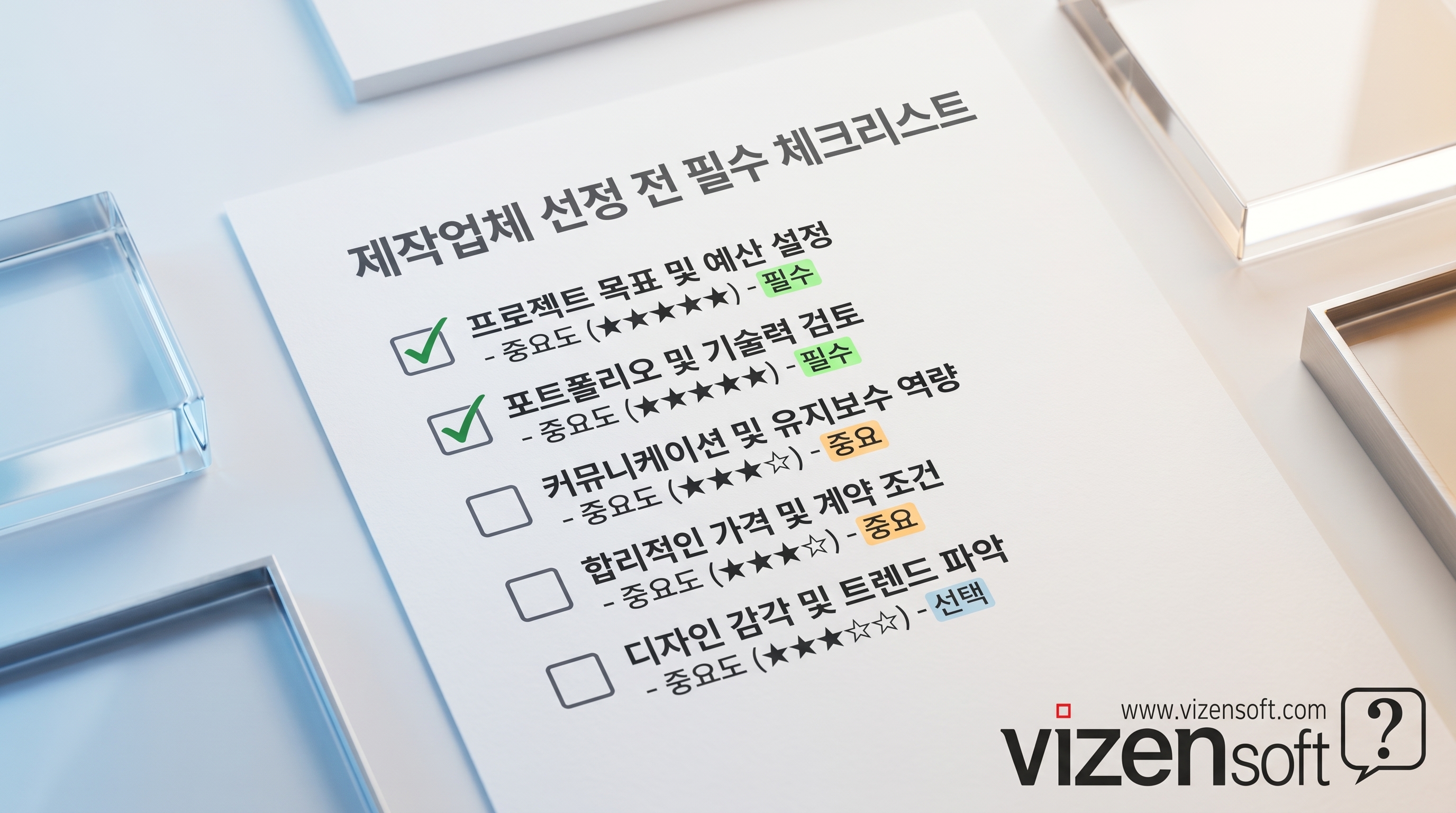 홈페이지 제작업체를 선정하기 전에 반드시 확인해야 할 체크리스트를 정리했습니다. 이 항목들을 제작업체에 직접 질문하고, 답변의 수준을 보면 그 업체의 역량을 판단할 수 있습니다.