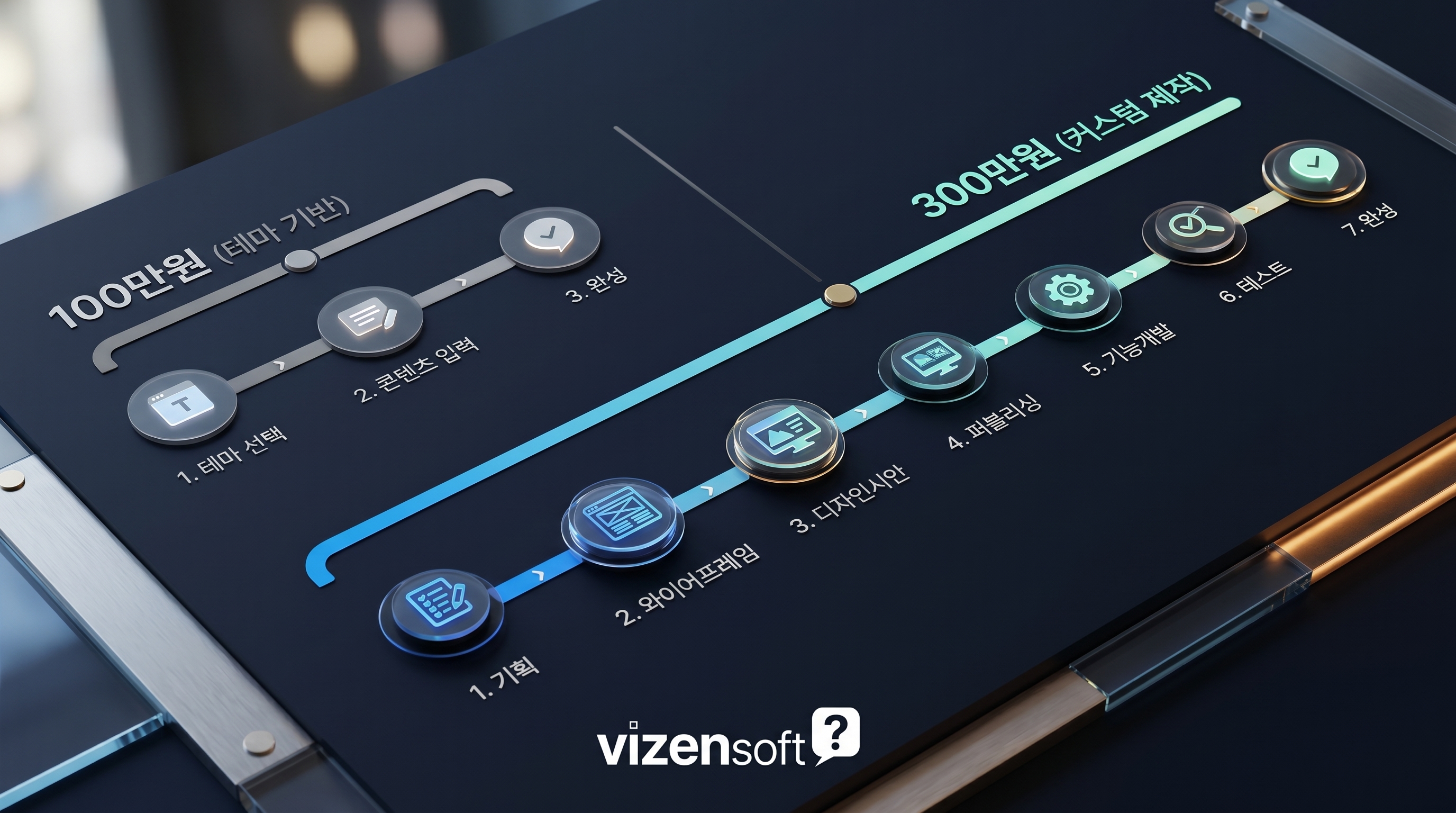 가격이 낮을수록 이 과정에서 생략되거나 자동화되는 단계가 많아집니다. 예를 들어, 100만 원대 홈페이지는 이미 만들어진 디자인 틀(테마)을 활용해 빠르게 조립하는 방식으로 제작됩니다. 반면 1,000만 원 이상의 프로젝트는 처음부터 끝까지 기획 → 와이어프레임 → 디자인 → 퍼블리싱 → 개발 → 테스트 → 배포의 전 단계를 해당 비즈니스에 맞게 맞춤 제작합니다. 중간 구간인 300만 원대는 디자인의 커스텀 범위와 기능 구현 수준이 두 구간의 중간 어딘가에 위치합니다.
