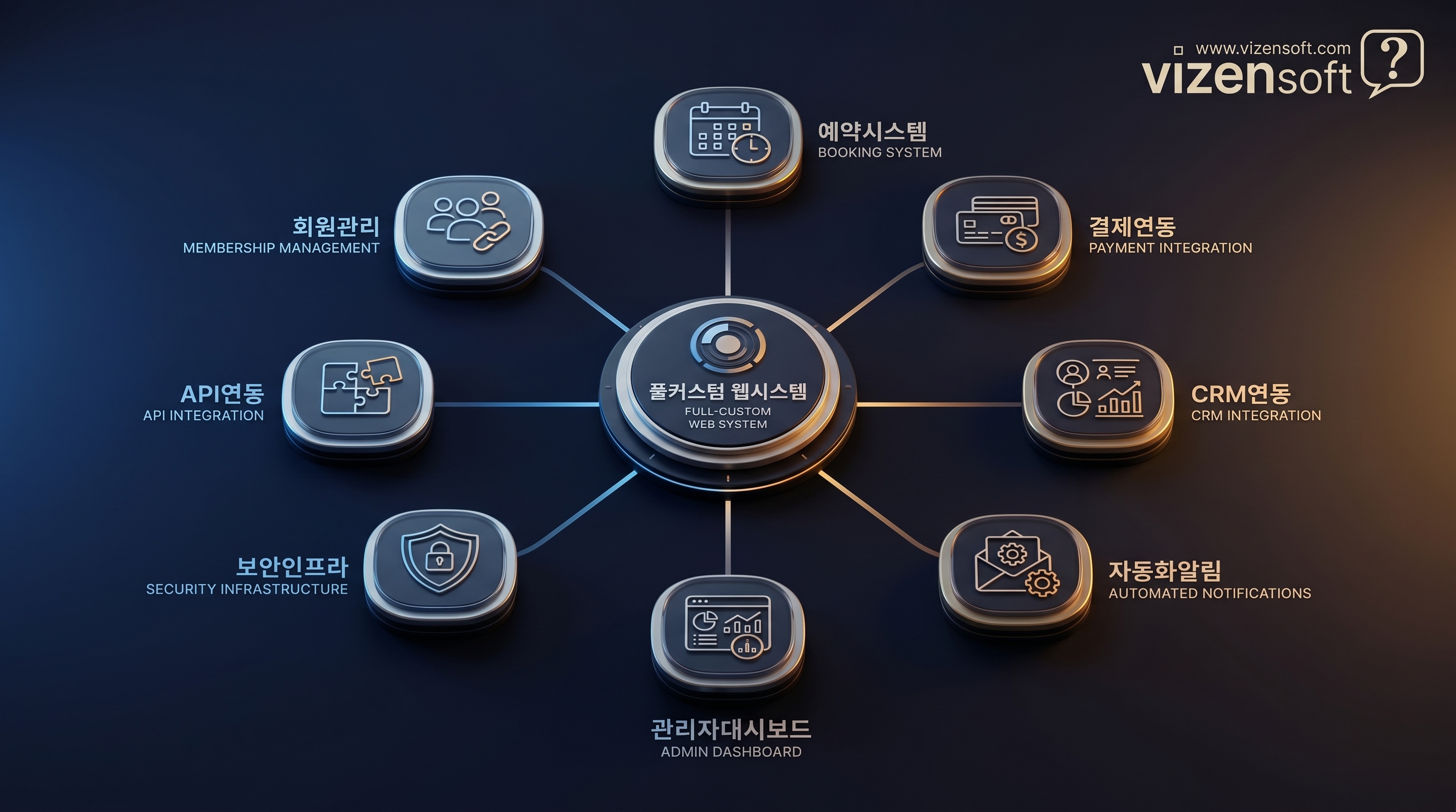 구체적인 예시를 들어 설명하면 이해가 더 빠릅니다. 온라인 B2B 플랫폼을 구축하는 기업이라면, 공급사 회원과 바이어 회원을 구분하여 각각 다른 대시보드를 보여주고, 견적 요청→견적 제안→계약→정산까지의 전체 프로세스를 웹 내에서 처리할 수 있는 시스템이 필요합니다. 이런 요구사항은 300만 원짜리 홈페이지로는 절대 구현할 수 없습니다. 또 의료기관이라면, 환자가 직접 진료 예약을 하고, 예약 현황을 관리자 화면에서 실시간으로 확인하며, SMS로 예약 확인 문자가 자동 발송되는 예약 관리 시스템이 필요한데, 이 역시 커스텀 개발 없이는 불가능합니다.
