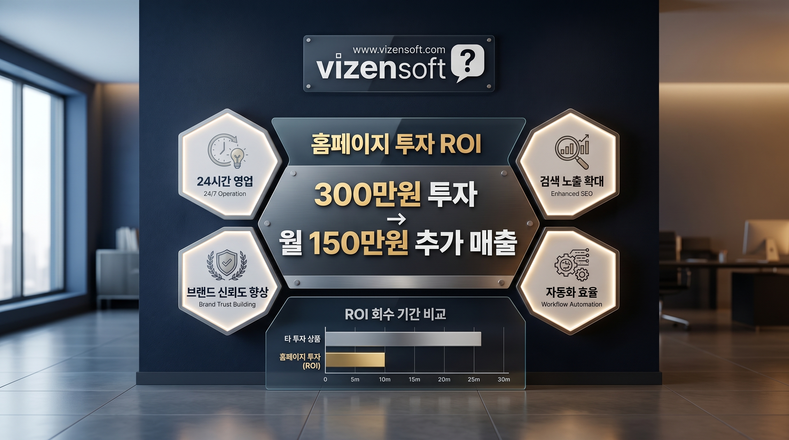 300만원 홈페이지의 ROI 시뮬레이션을 예로 들어보겠습니다. 월 홈페이지 방문자 500명 기준, 문의 전환율 2% 적용 시 월 10건의 신규 문의가 발생합니다. 이 중 성약률 30% 적용 시 월 3건의 신규 계약. 계약 1건당 평균 단가가 50만 원이라면 월 150만 원의 추가 매출이 발생하고, 이 경우 제작비 300만 원의 회수 기간은 불과 2개월입니다. 물론 이는 SEO 최적화와 콘텐츠 운영이 병행될 때 현실적인 수치입니다.