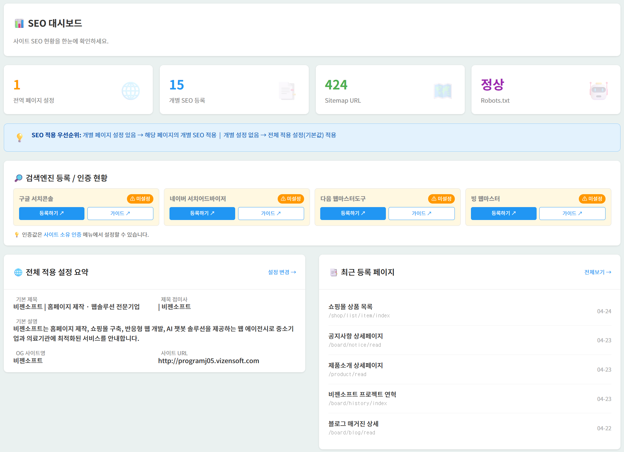 ▲ SEO 관리 대시보드 — 4개 핵심 지표(전역 1건·개별 15건·Sitemap 424 URL·Robots.txt 정상)와 4대 검색엔진 인증 현황, SEO 적용 우선순위 안내, 최근 등록 페이지 목록이 한 화면에 표시됩니다