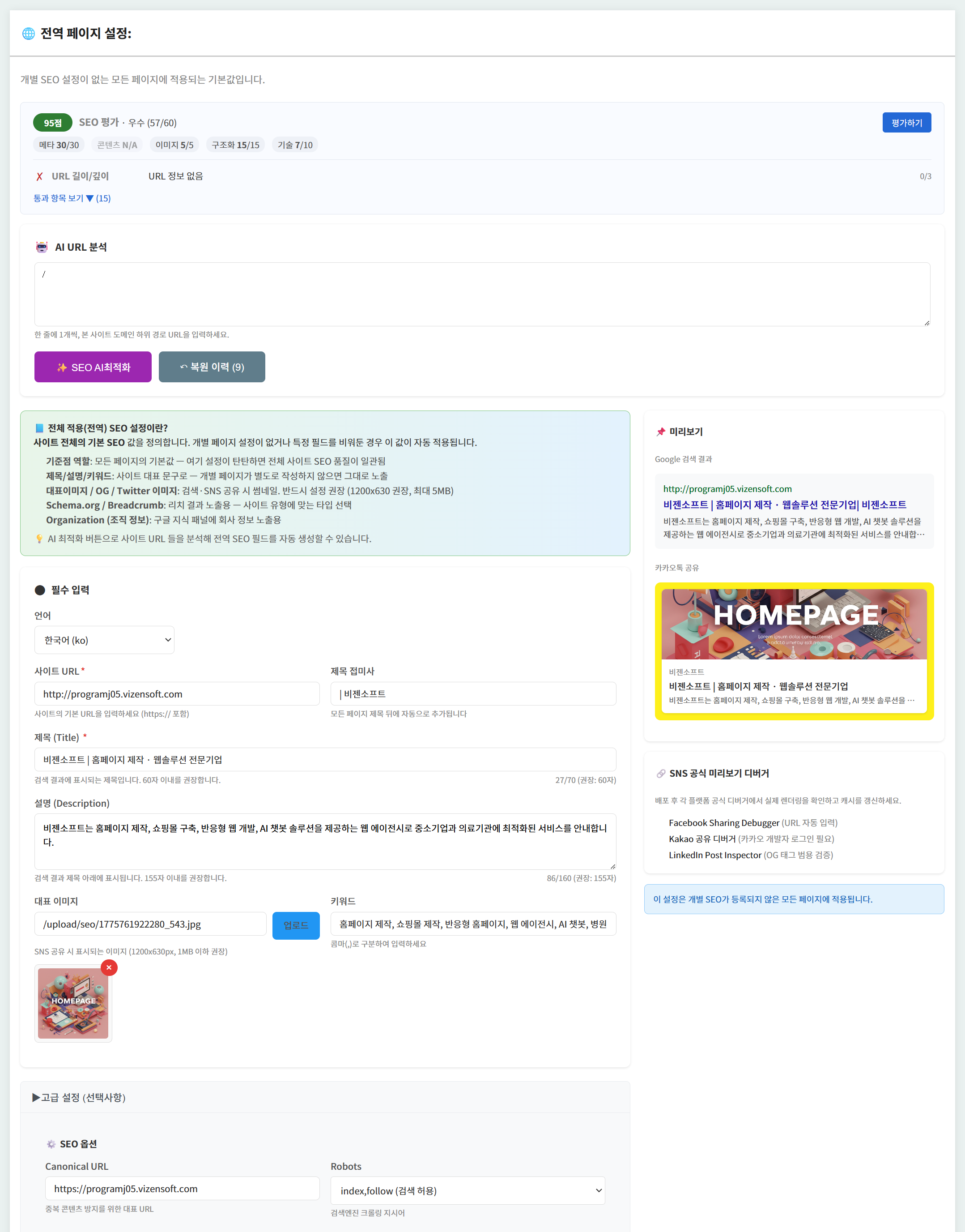 ▲ 전역 페이지 설정 — 기본 메타태그·Open Graph·Twitter Card·Schema.org를 한 화면에서 입력하고, 우측 실시간 미리보기 패널에서 구글 검색·카카오톡 공유 카드를 즉시 검증합니다
