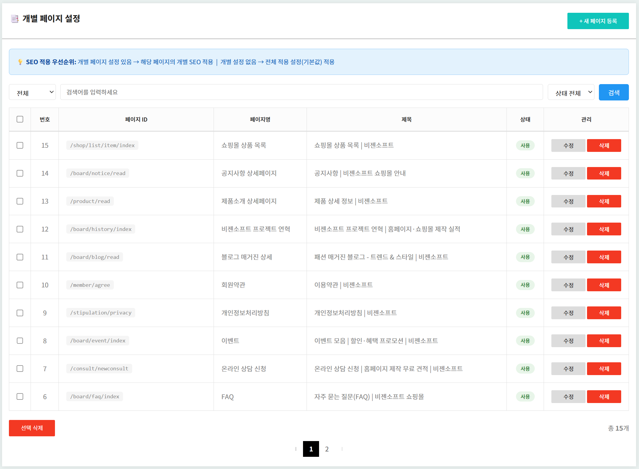 ▲ 개별 페이지 설정 목록 — 등록된 페이지(쇼핑몰 상품 목록·공지사항·제품소개·이벤트·FAQ 등)의 SEO 설정 상태와 사용 여부를 일괄 관리하고, 검색·필터·일괄 삭제까지 지원합니다