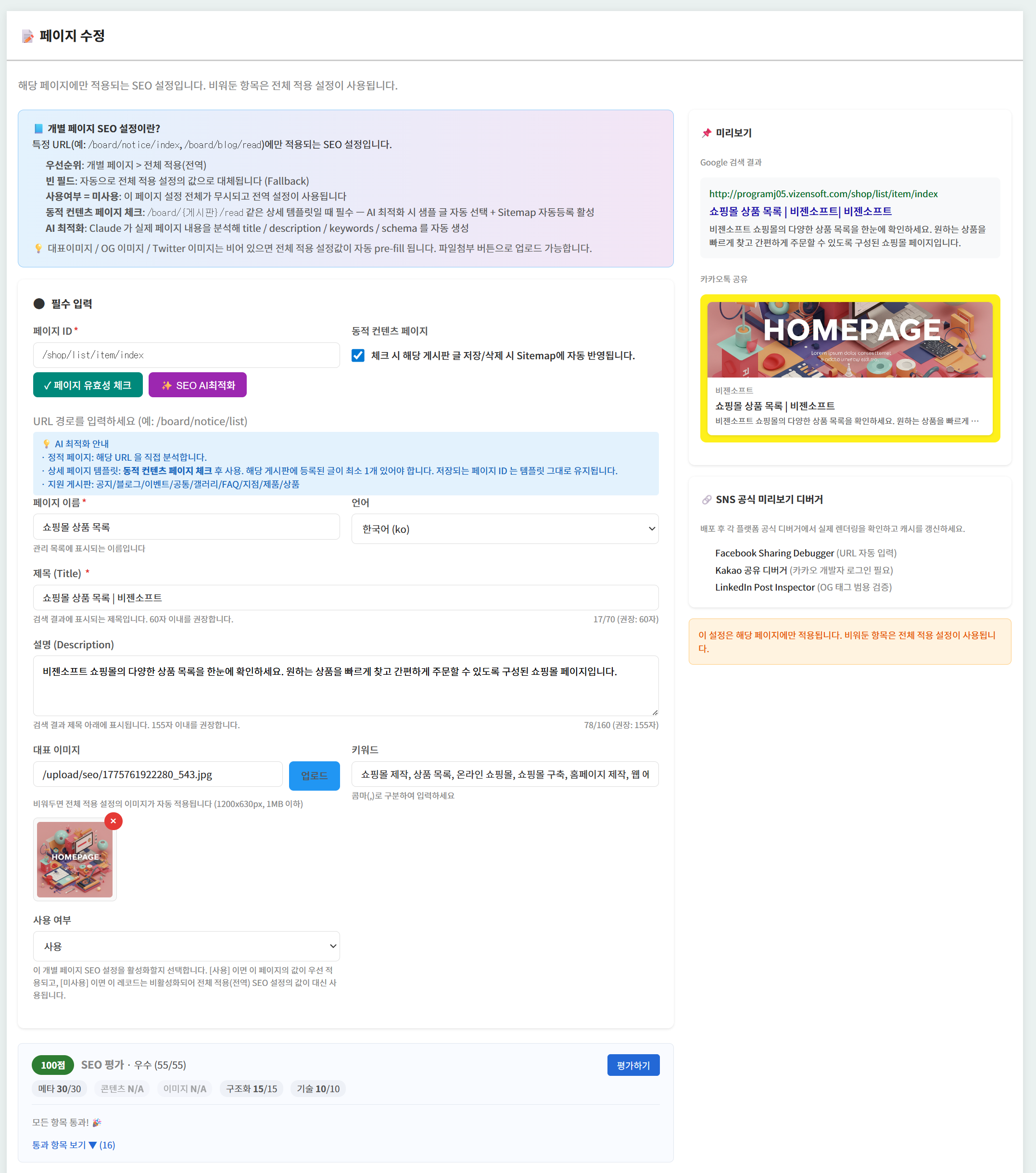 ▲ 개별 페이지 등록/수정 화면 — 메타태그·Open Graph·Twitter Card·Schema.org·Sitemap·Robots를 직관적 폼으로 입력하고, 우측에서 구글·카카오톡 공유 미리보기를 실시간 확인합니다