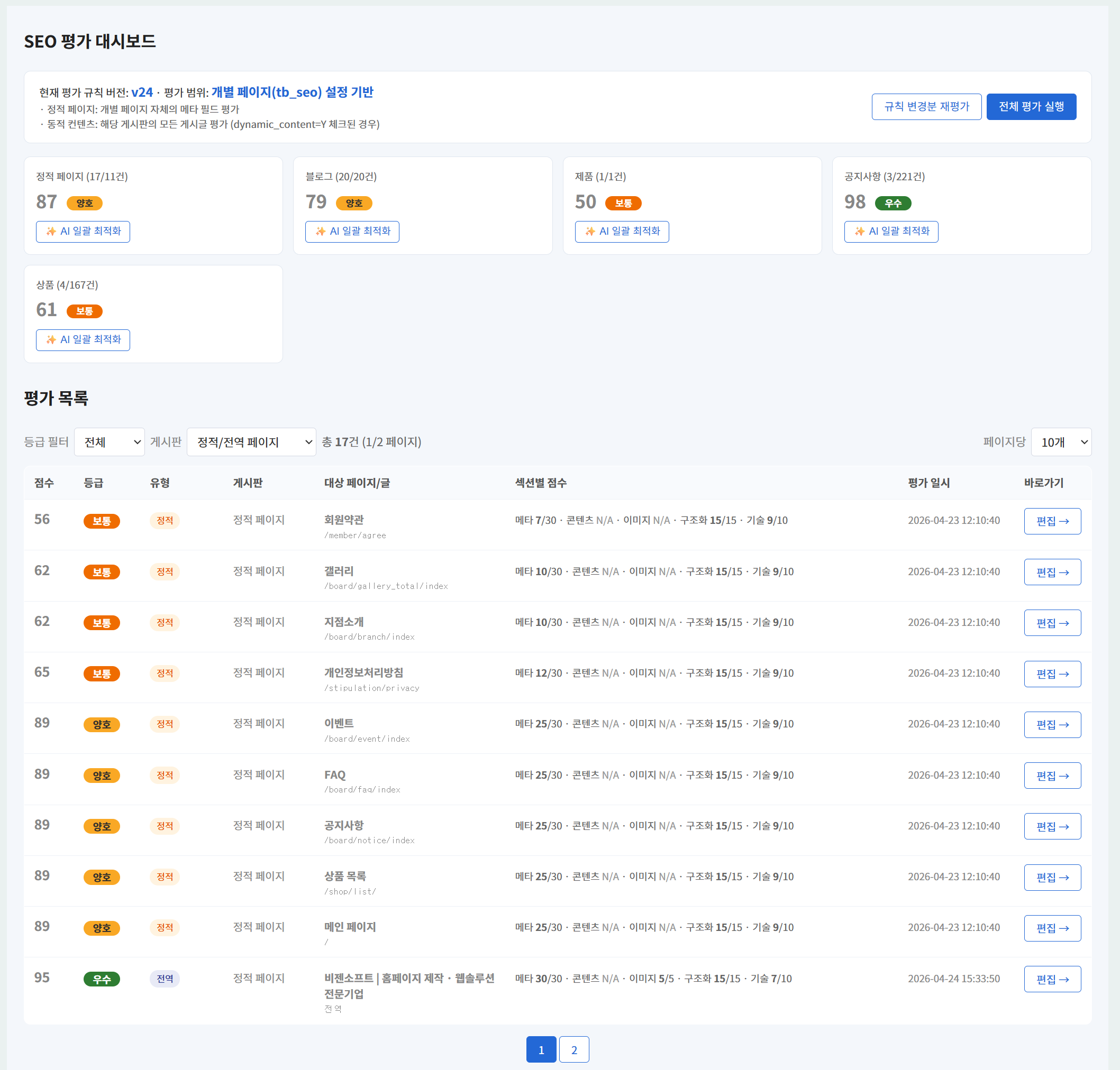 ▲ SEO 평가 대시보드 — 사이트 평균 87점, 게시판별 평균(공지사항 79점·제품소개 50점·이벤트 56점·블로그 61점), 평가 목록과 등급별 필터로 약점 페이지를 즉시 식별합니다