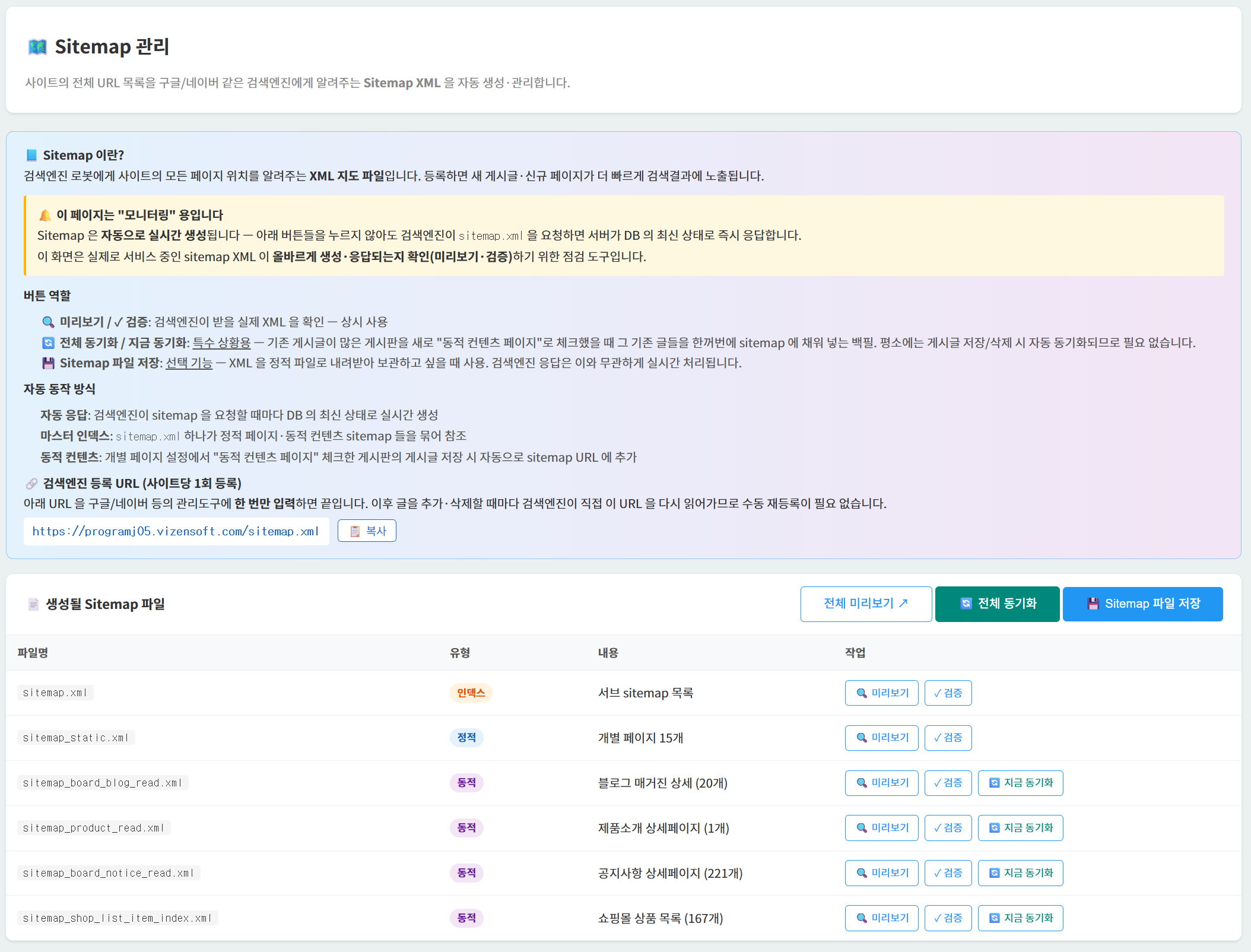 Sitemap 관리 | XML 수동 작성/갱신 | 자동 생성 | 자동 + 게시판별 분할 |