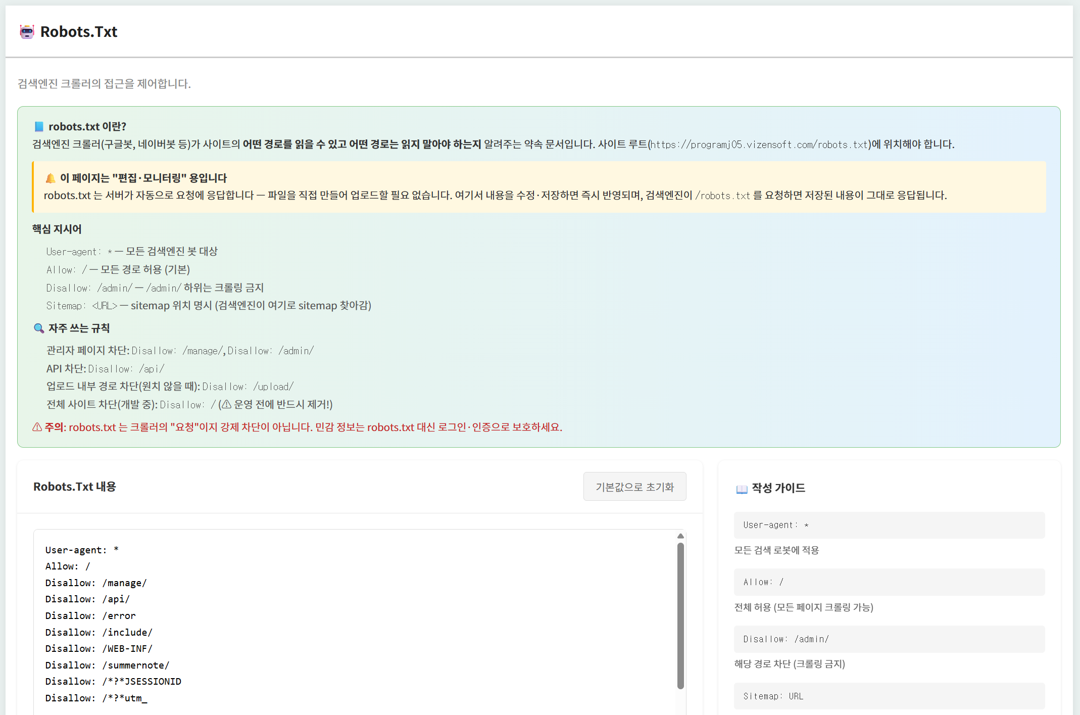 비젠소프트 SEO 관리 시스템은 Robots.txt를 관리자 화면 코드 에디터에서 직접 편집할 수 있도록 제공합니다. 우측에 활용 가이드(User-agent / Allow / Disallow / Sitemap 지시어 설명)와 주의사항이 상시 표시되어, 잘못된 설정으로 인한 사고를 방지합니다.