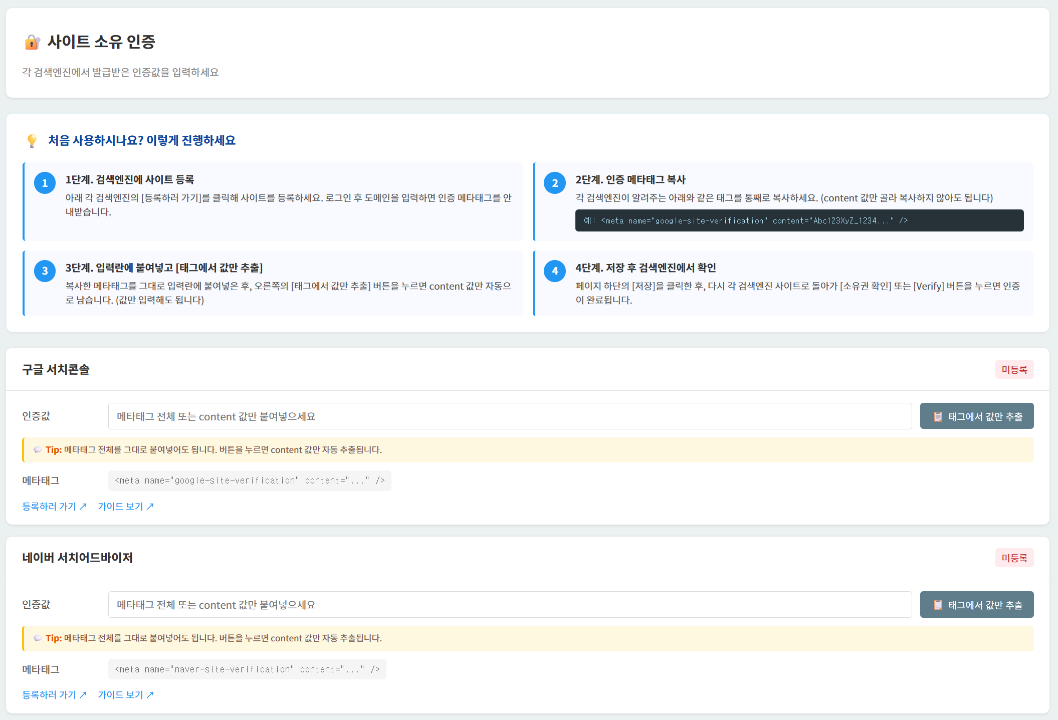 각 검색엔진의 사이트 소유 확인 메타태그를 입력만 하면, 전체 페이지의 `<head>`에 자동으로 삽입되어 검증이 완료됩니다. 인증 메타태그가 잘못 들어가서 페이지가 깨지는 사고도 방지됩니다.