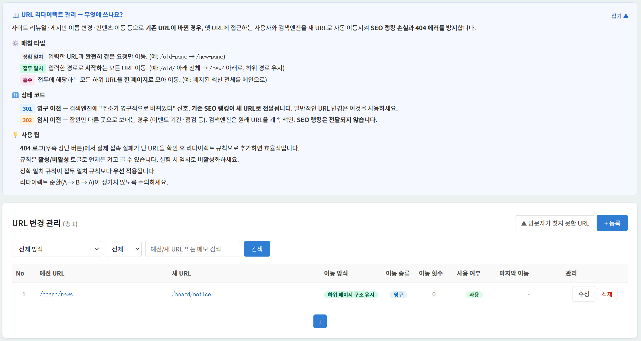 ▲ URL 변경 관리 — 정확 일치/접두 일치 매칭 타입과 301(영구)/302(임시) 상태 코드를 선택하여 URL 이전 규칙을 등록. 404 로그에서 자주 실패한 URL을 한 번에 리다이렉트로 추가할 수 있는 단축 버튼도 제공됩니다