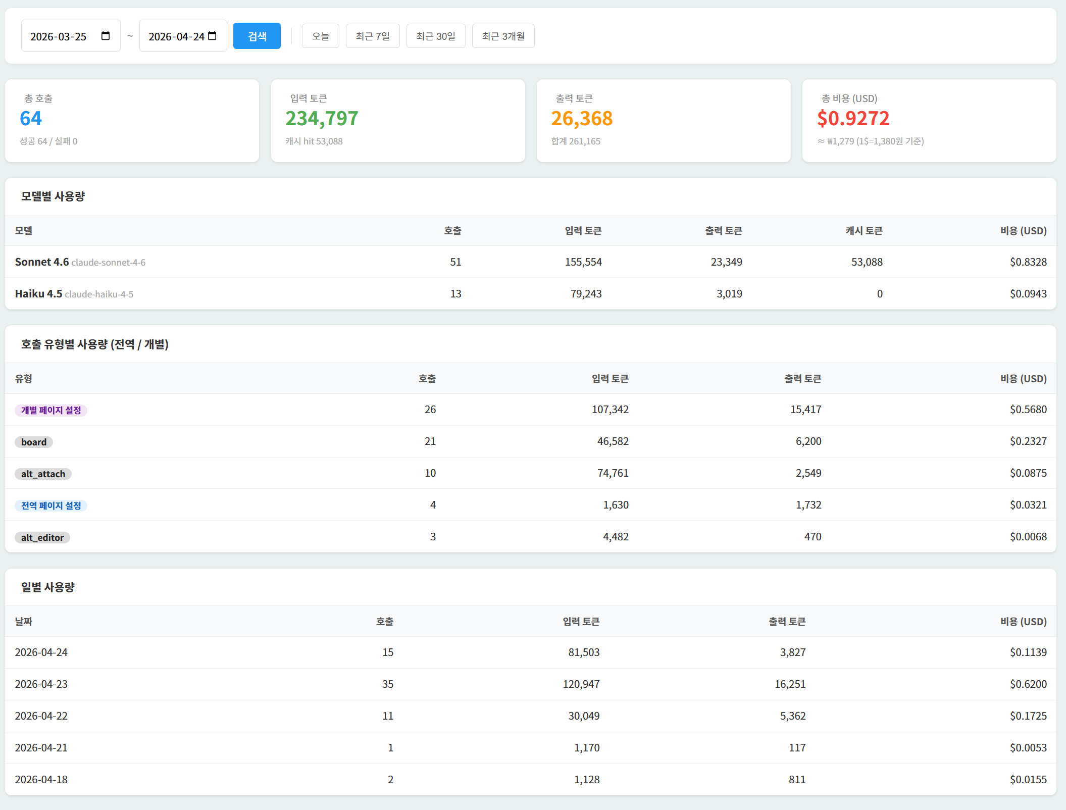 그리고 모든 AI 호출은 비용 추적이 자동으로 이루어집니다. 호출 한 건마다 토큰 수와 비용을 기록하여, "이번 달 AI alt 생성에 얼마 썼는지" 즉시 확인할 수 있습니다.