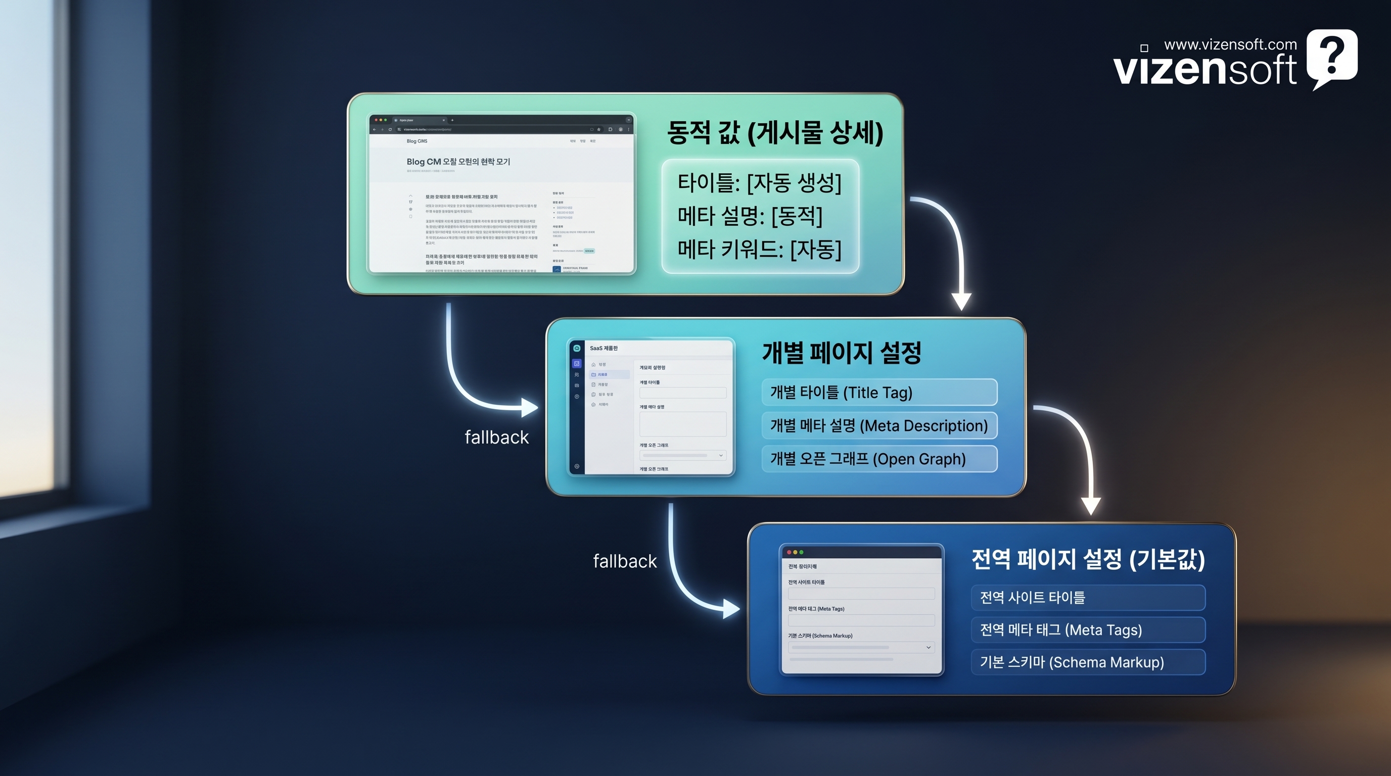전역 페이지 설정에서 입력한 제목·설명·키워드·OG 이미지·Schema.org가 개별 SEO가 등록되지 않은 모든 페이지에 자동 적용됩니다. 제목 접미사(예: | 비젠소프트) 기능으로 모든 페이지 제목 끝에 브랜드명을 자동 추가할 수도 있습니다.