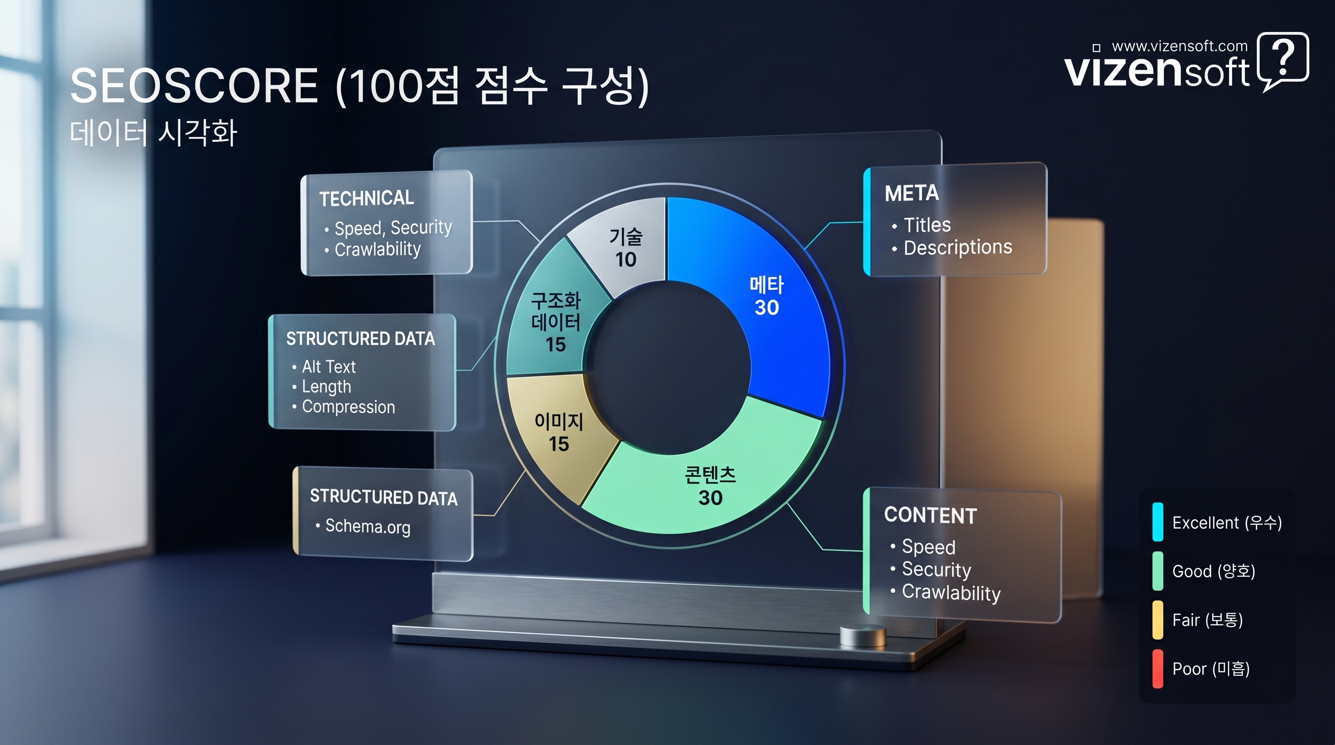 비젠소프트 SEO 관리 시스템은 자체 SEO 평가 엔진(SeoScoreEvaluator)을 내장하고 있습니다. 모든 페이지와 게시판 상세 글에 대해 100점 만점으로 점수를 매기고, 우수(90+) / 양호(70+) / 보통(50+) / 미흡(50미만) 4단계 등급으로 분류합니다.