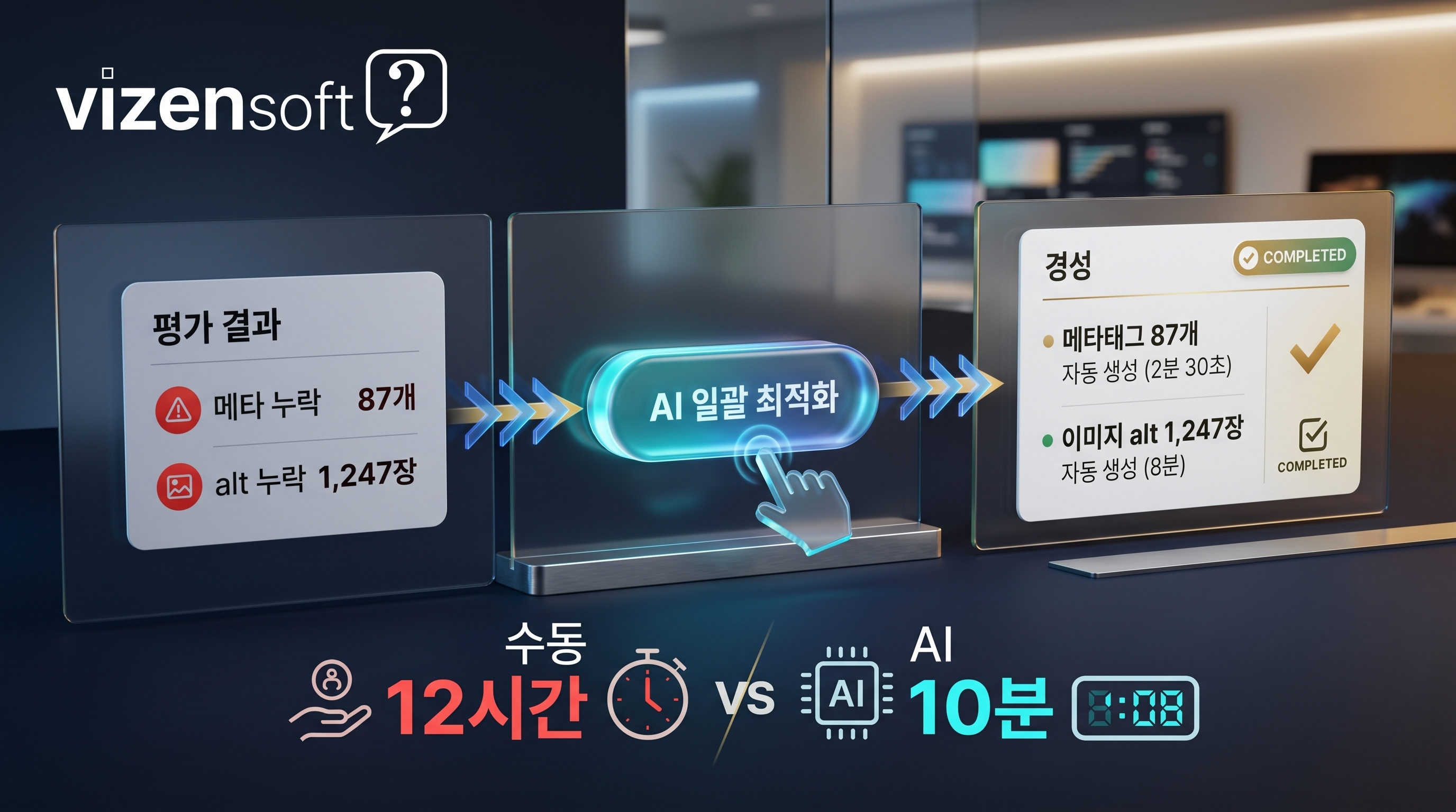 진단 결과 "메타 설명이 비어 있는 페이지 87개", "alt 누락 이미지 1,247장"이 나왔습니다. 그런데 이걸 누가 다 작성할까요? 마케터 한 명이 하나씩 작성하면 한 달이 걸리고, 외주를 주면 수백만 원이 나갑니다. 결국 점수만 알고 못 고치는 상황이 반복됩니다.