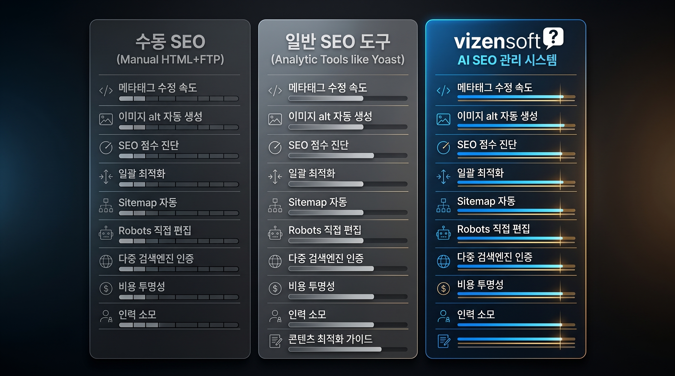 항목 | 수동 SEO 관리 | 일반 SEO 도구 | 비젠소프트 AI SEO 관리 시스템 |