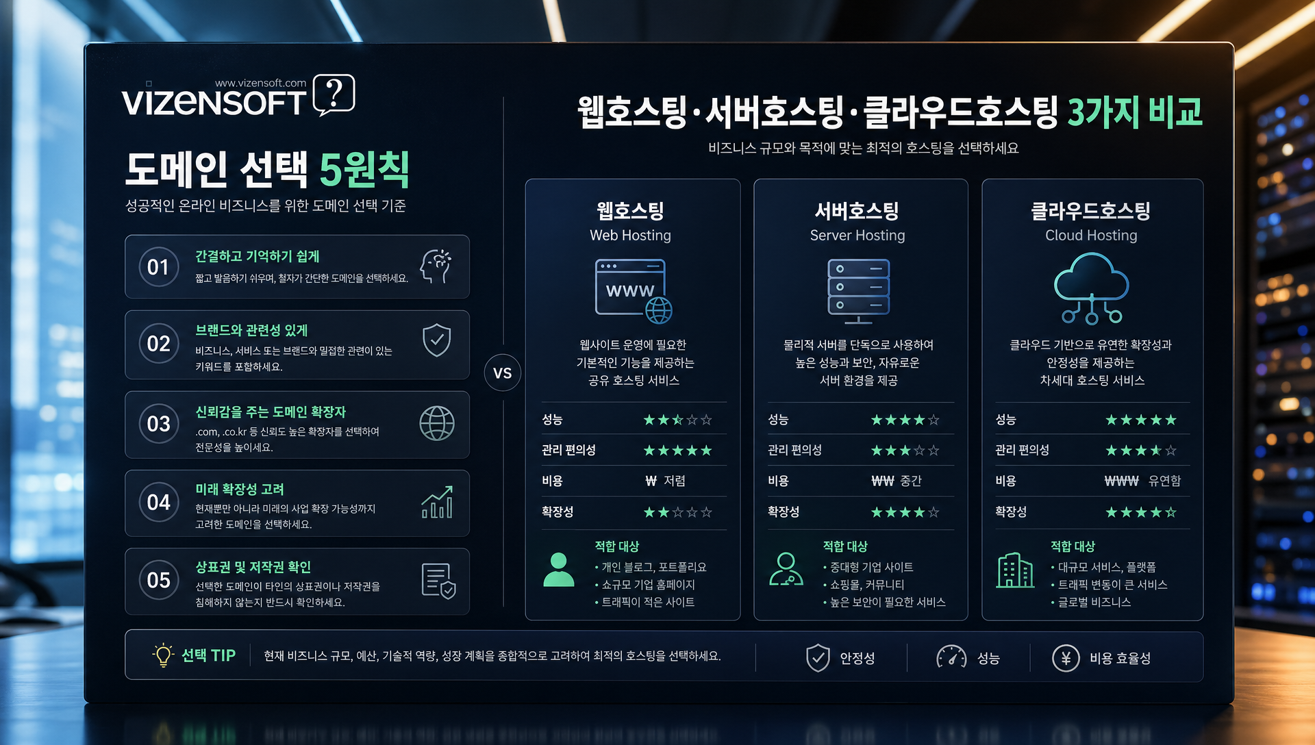 사업 규모와 예상 트래픽에 맞는 호스팅 유형 선택(초보자는 웹호스팅 권장). 서버 위치, 속도, 지원 수준 확인.