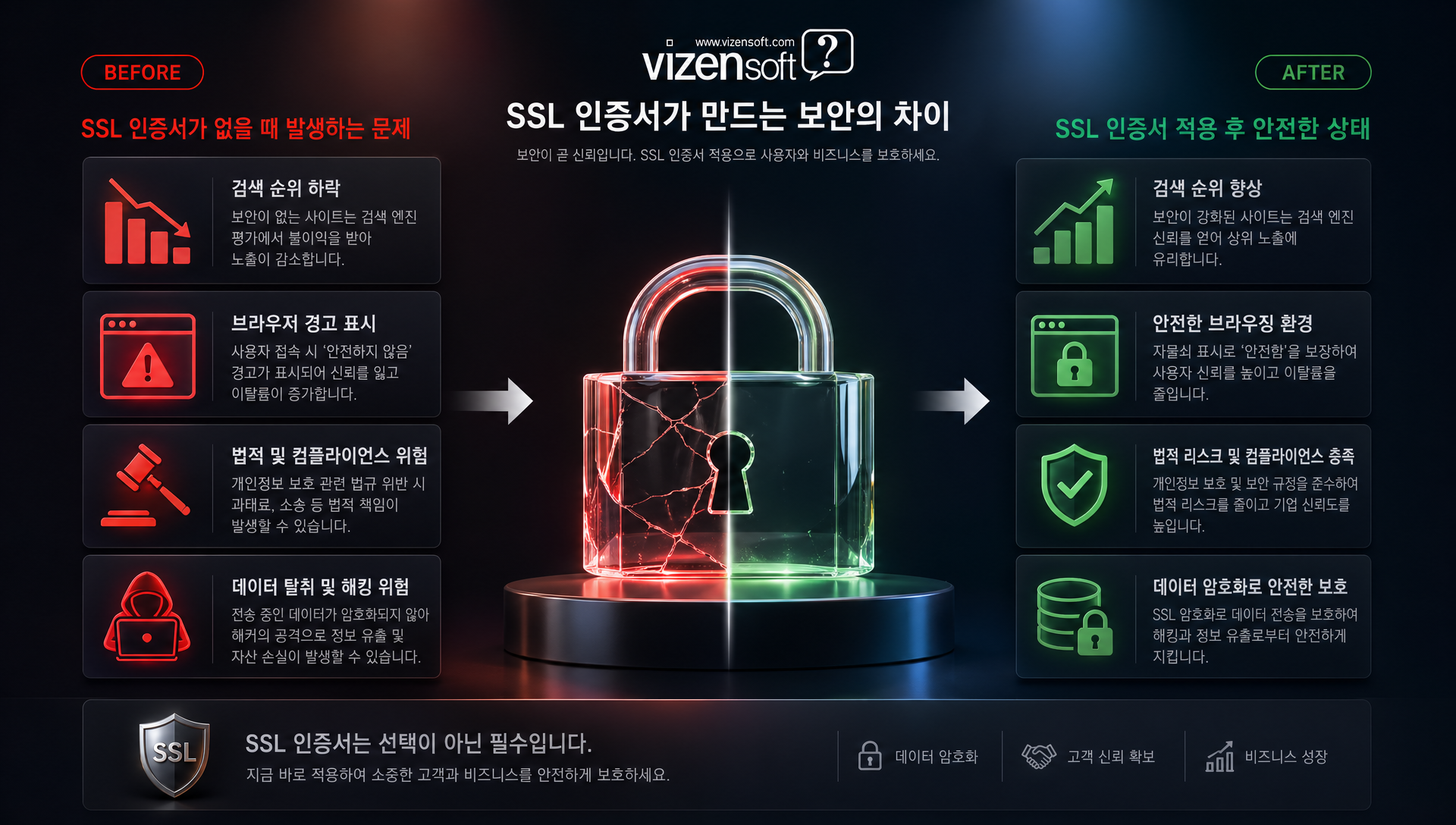 브랜드 신뢰도: SSL 자물쇠 아이콘이 있는 안전한 사이트는 방문자의 신뢰를 즉시 획득합니다. 보안 경고가 없는 사이트의 전환율은 평균적으로 20~40% 높다는 연구 결과가 있습니다.
