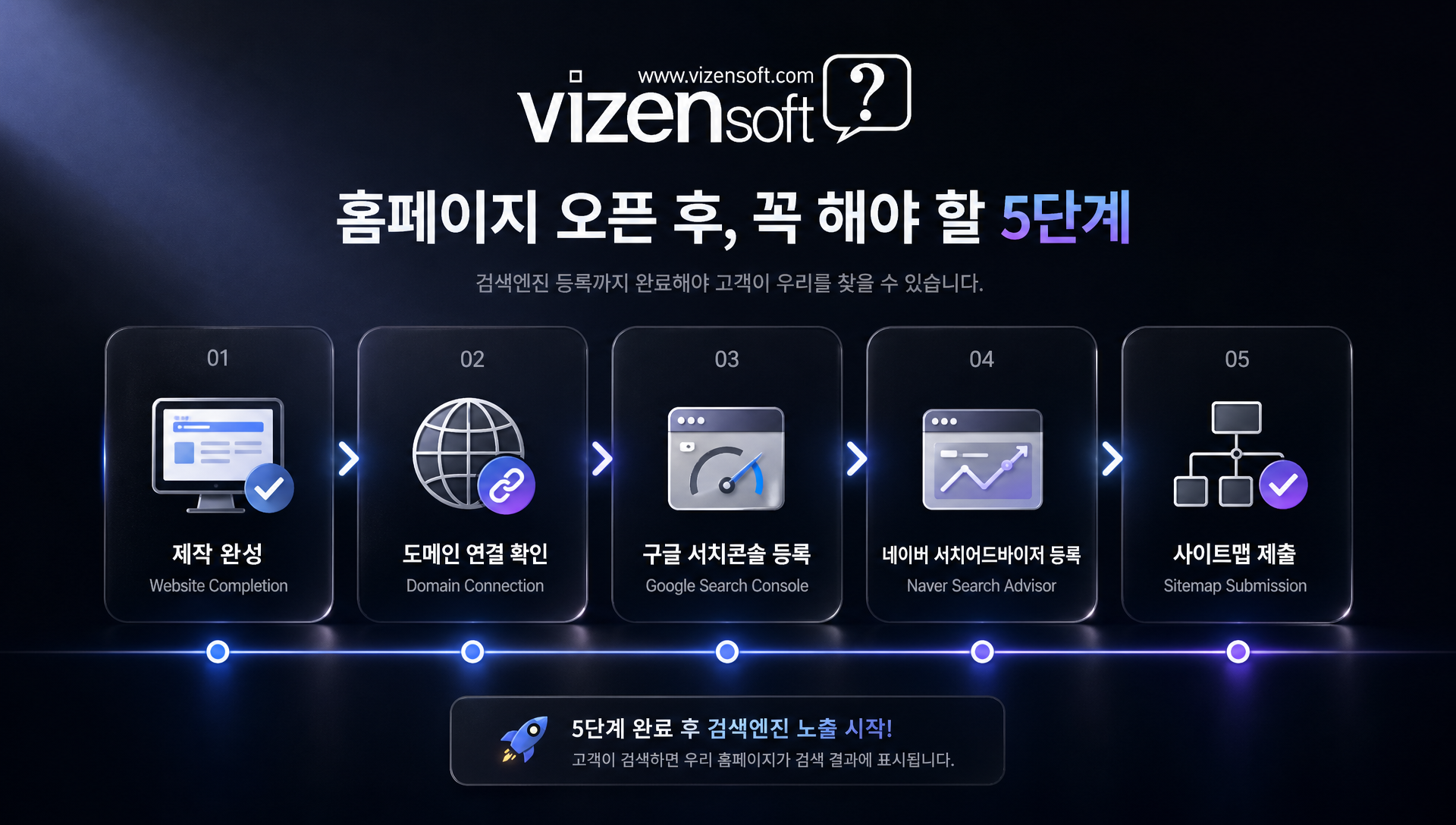 검색엔진 등록은 홈페이지 오픈 당일, 또는 늦어도 오픈 첫째 주 안에 완료해야 합니다. 늦으면 늦을수록 검색 노출 시작 시점이 그만큼 뒤로 밀립니다.