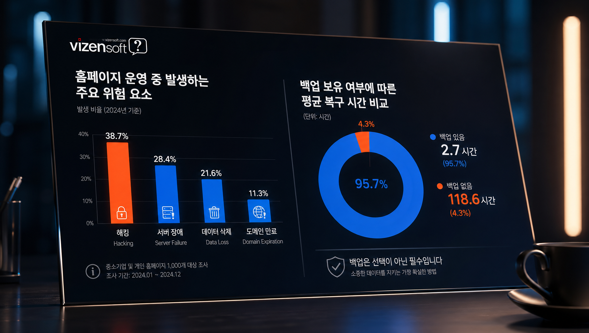 국내 중소기업 대상 조사에서 홈페이지 운영 중 한 번이라도 데이터 손실을 경험한 비율이 약 30%에 달한다는 결과도 있습니다. 그리고 백업 없이 복구를 시도하는 경우, 상당수가 홈페이지 전체를 처음부터 다시 만들어야 하는 상황에 처합니다.