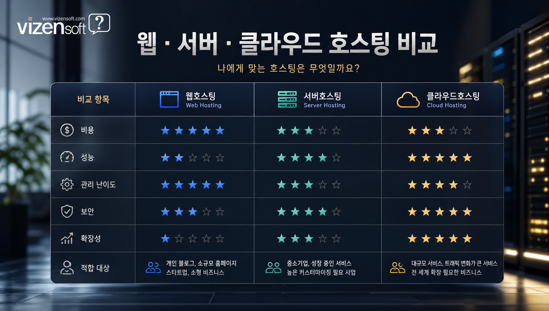 초보 사업자라면 대부분 웹호스팅으로 시작하는 것이 현실적입니다. 관리 부담이 적고 비용이 낮으며, 나중에 트래픽이 증가하면 클라우드나 서버호스팅으로 업그레이드할 수 있습니다.