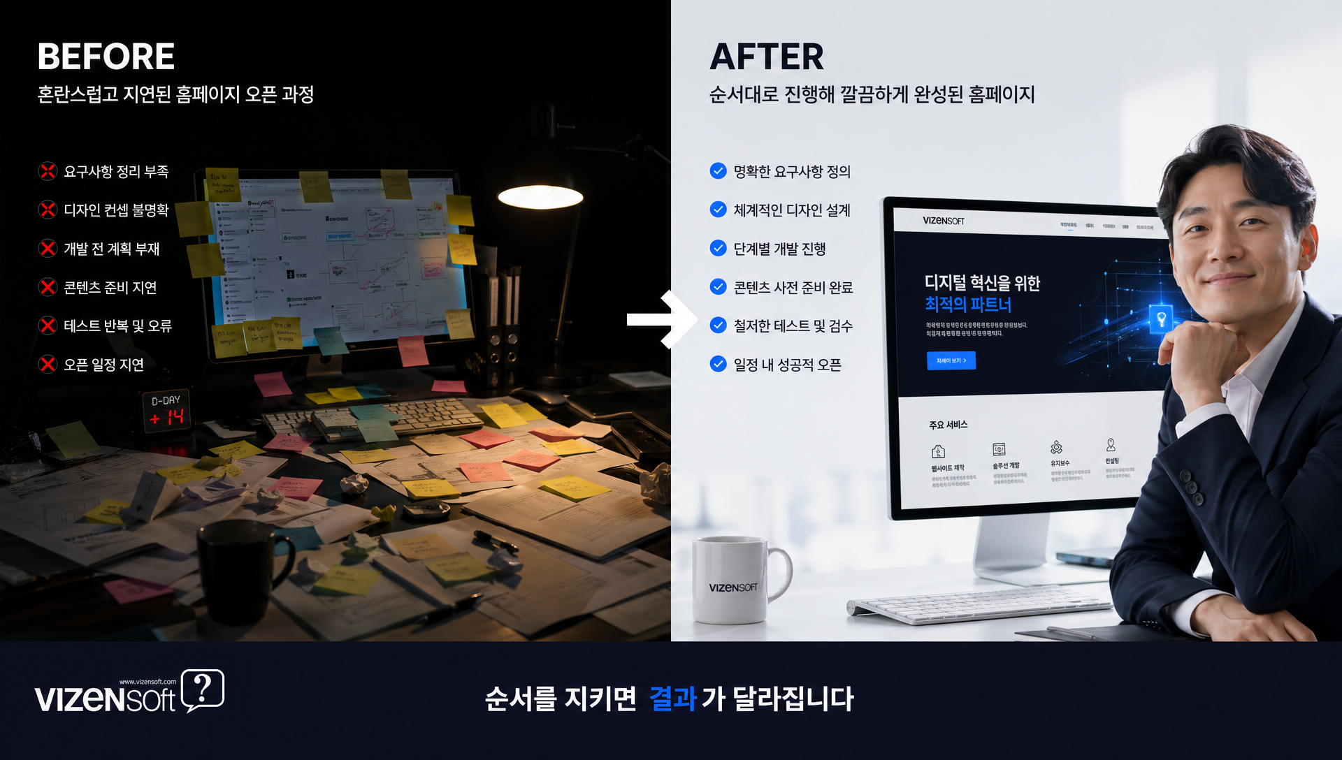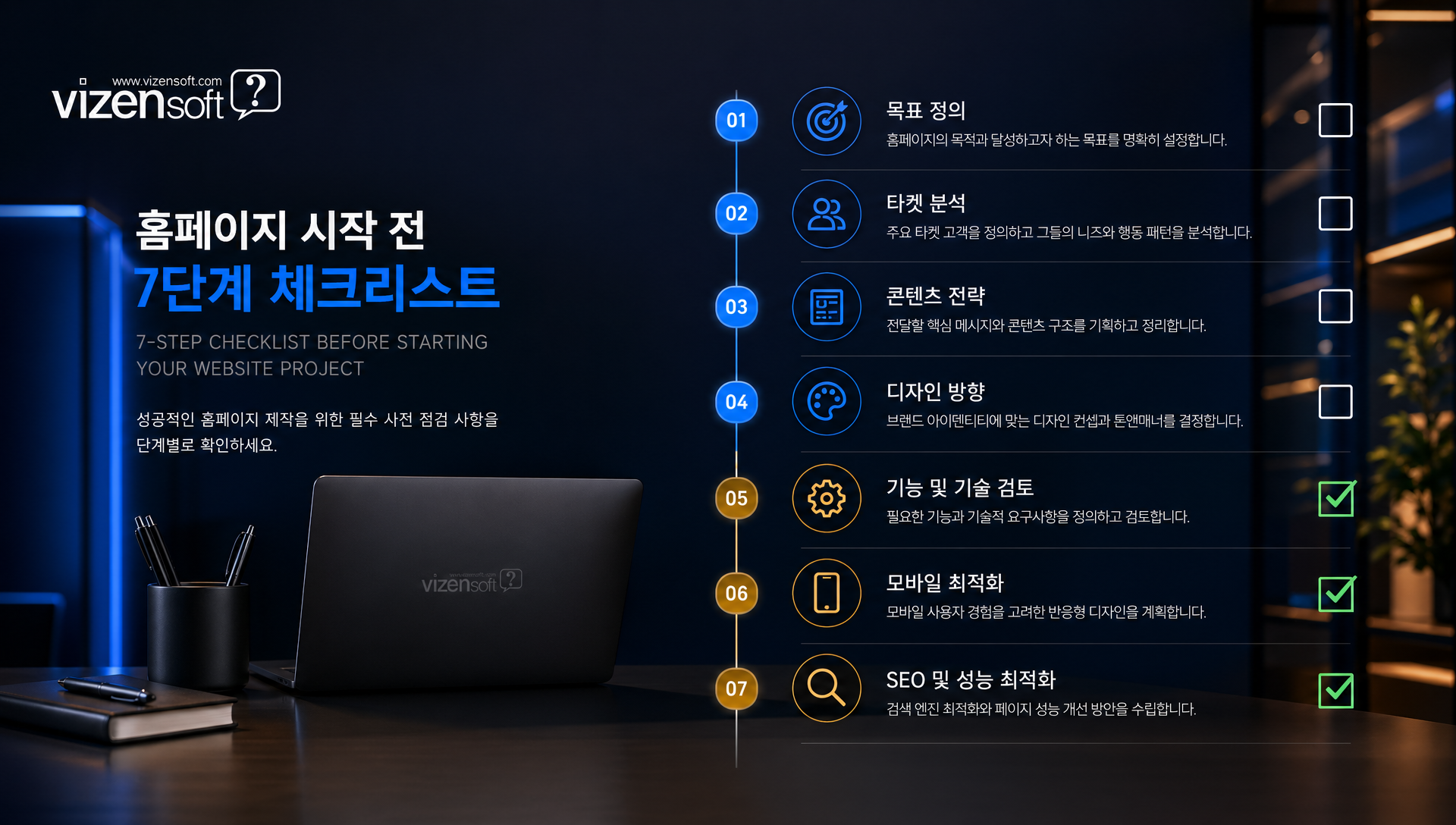 홈페이지를 처음 시작하는 초보 사업자가 반드시 확인해야 할 7단계 체크리스트를 정리했습니다. 이 순서대로 진행하면 시행착오 없이 안정적으로 홈페이지를 오픈할 수 있습니다.