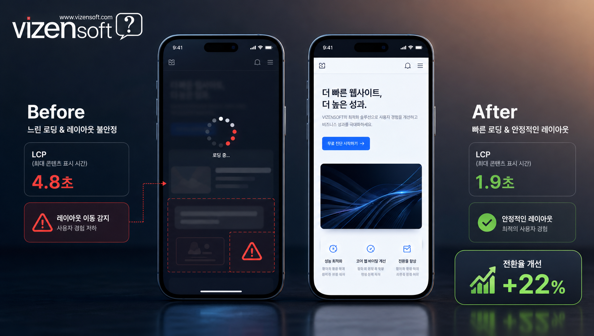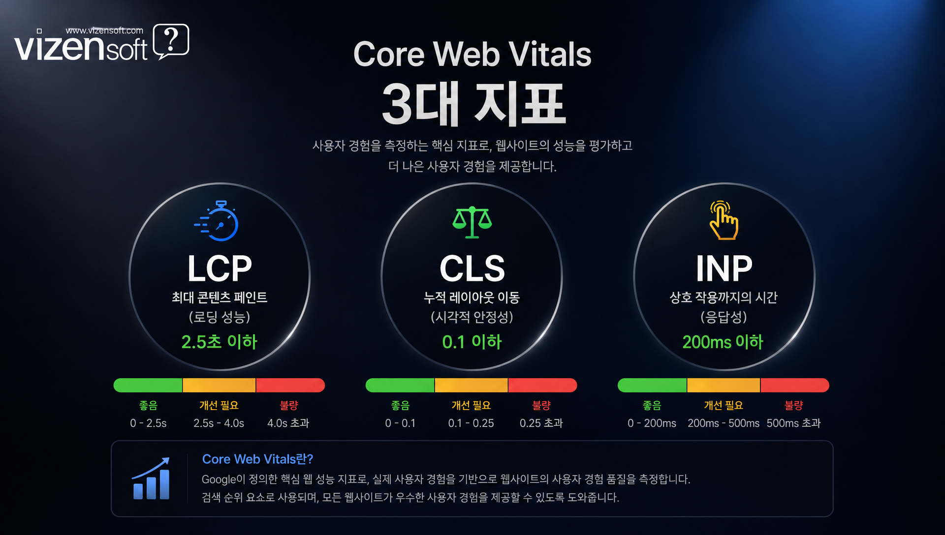 특히 쇼핑몰, 콘텐츠 미디어, 메디컬·병원 사이트처럼 모바일 유입 비중이 높은 업종이라면 더욱 그렇습니다. 환자가 증상을 검색하는 순간, 소비자가 상품을 찾는 순간 — 그 첫 접점에서 느린 속도는 신뢰도 하락과 직결됩니다. 이 글에서는 Core Web Vitals의 3대 지표인 LCP, CLS, INP를 완전히 이해하고, 실질적인 개선 방법과 비젠소프트가 제공하는 솔루션까지 한 번에 정리해 드리겠습니다.