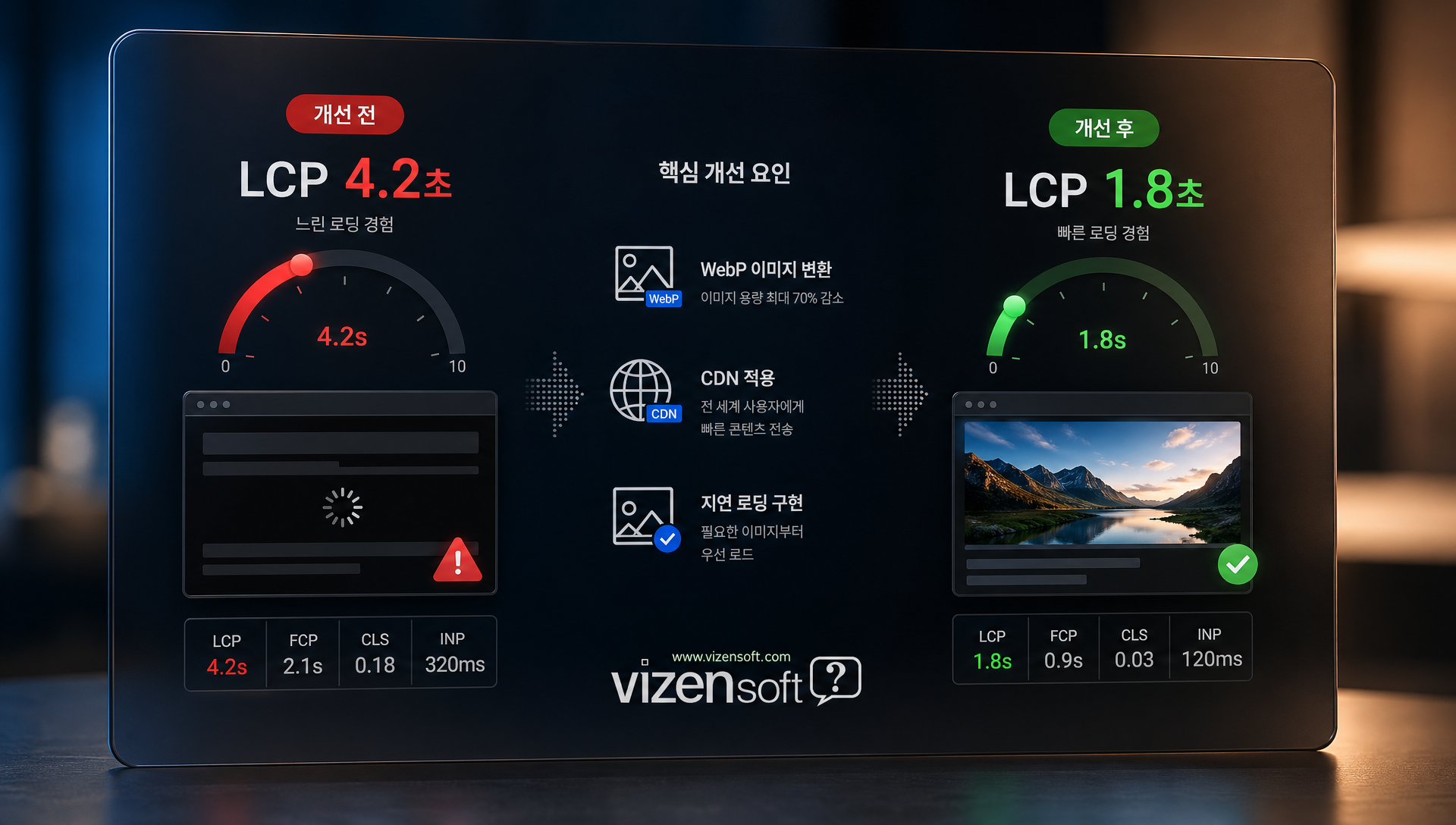 비젠소프트는 Core Web Vitals 최적화를 플랫폼 레벨에서 기본 탑재한 솔루션을 제공합니다. 이미지 자동 WebP 변환, AI 기반 alt 텍스트 생성, 반응형 모바일 퍼스트 템플릿, 이미지 지연 로딩, SSL/HTTP2, 최적화 호스팅 환경까지 — 별도의 복잡한 개발 없이도 Core Web Vitals 그린 등급에 한 걸음 더 가까워질 수 있습니다.