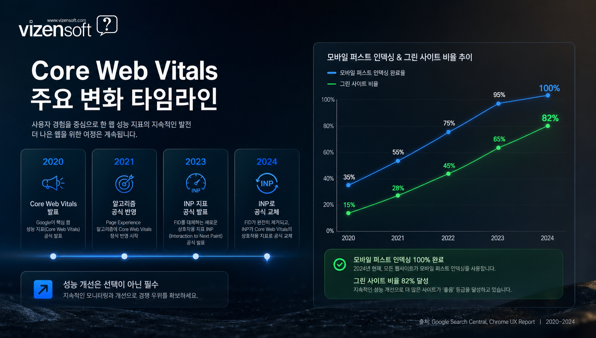 Core Web Vitals는 고정된 개념이 아닙니다. 구글은 매년 지표를 업데이트하고 기준을 강화하는 방향으로 진화하고 있습니다. 이 트렌드를 이해하는 것은 단기적 최적화가 아니라 지속 가능한 SEO 전략 수립에 필수적입니다.