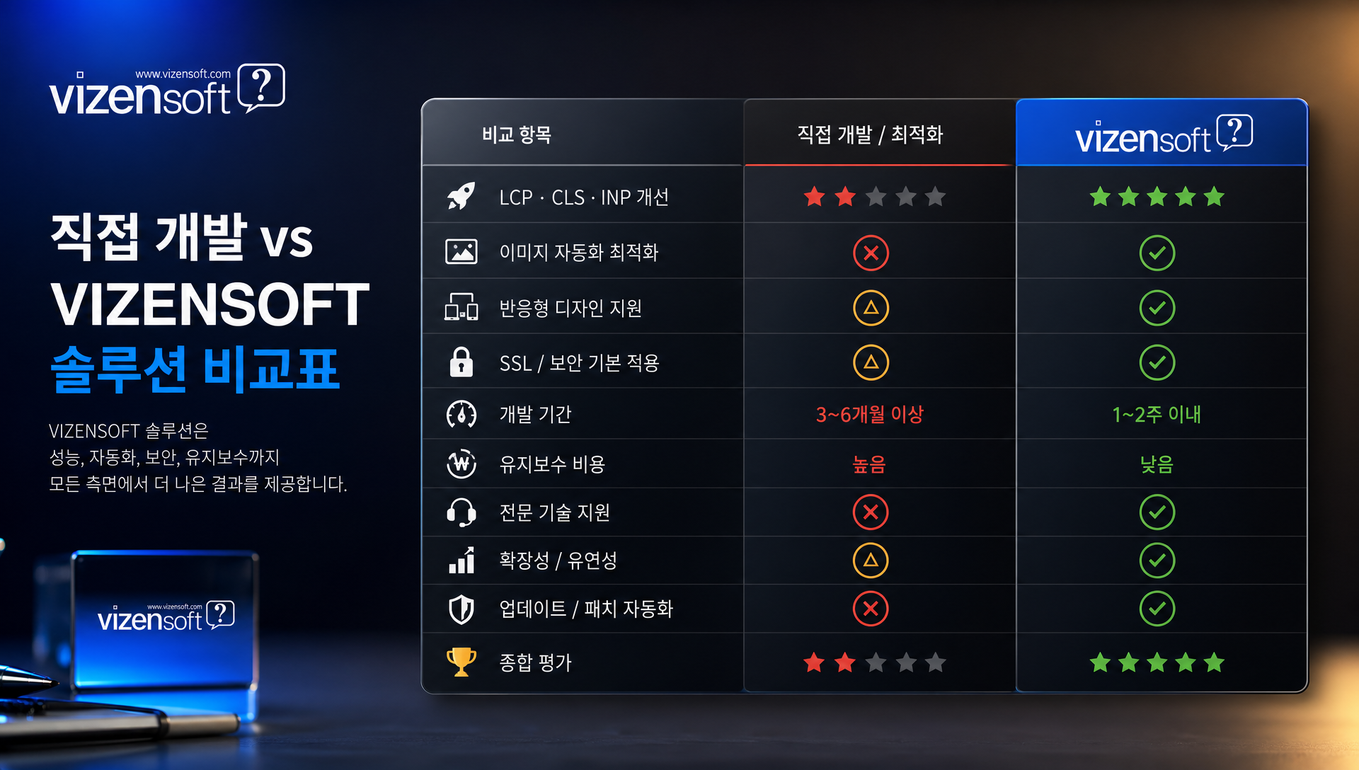 | 구분 | 직접 개발/수동 최적화 | 최적화 솔루션 (비젠소프트) |