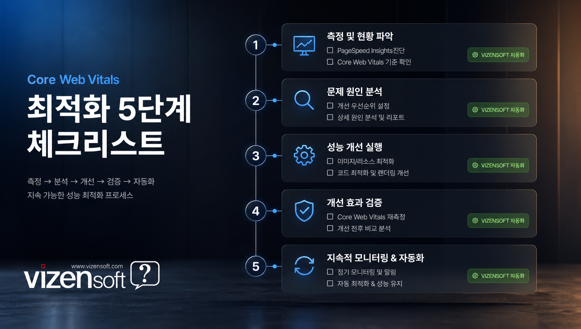 Core Web Vitals 최적화를 처음 시작하신다면, 아래 단계별 체크리스트를 활용해 현재 상태를 점검하고 우선순위를 설정하세요. 비젠소프트의 솔루션(programj05)은 이 항목들 중 상당 부분을 자동화하거나 기본 내장합니다.