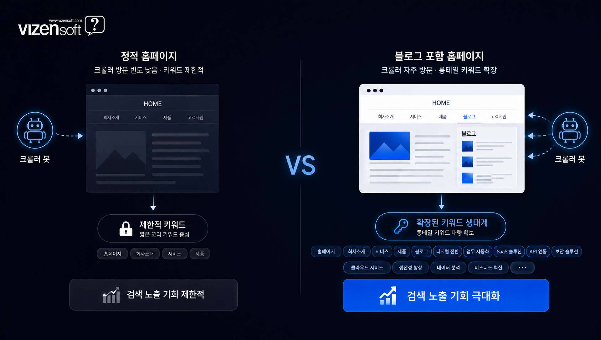 정적인 페이지만으로 구성된 홈페이지는 검색 엔진 입장에서 보면 "이미 다 알고 있는 사이트"입니다. 크롤러가 한 번 방문해서 모든 페이지를 수집해 가면, 그다음에는 딱히 다시 올 이유가 없어요. 반면 블로그처럼 새로운 콘텐츠가 꾸준히 쌓이는 사이트는 크롤러가 "여기는 자주 들러야 하는 곳"으로 인식합니다. 이 차이가 장기적으로 검색 노출 빈도와 순위에 엄청난 격차를 만들어냅니다.
