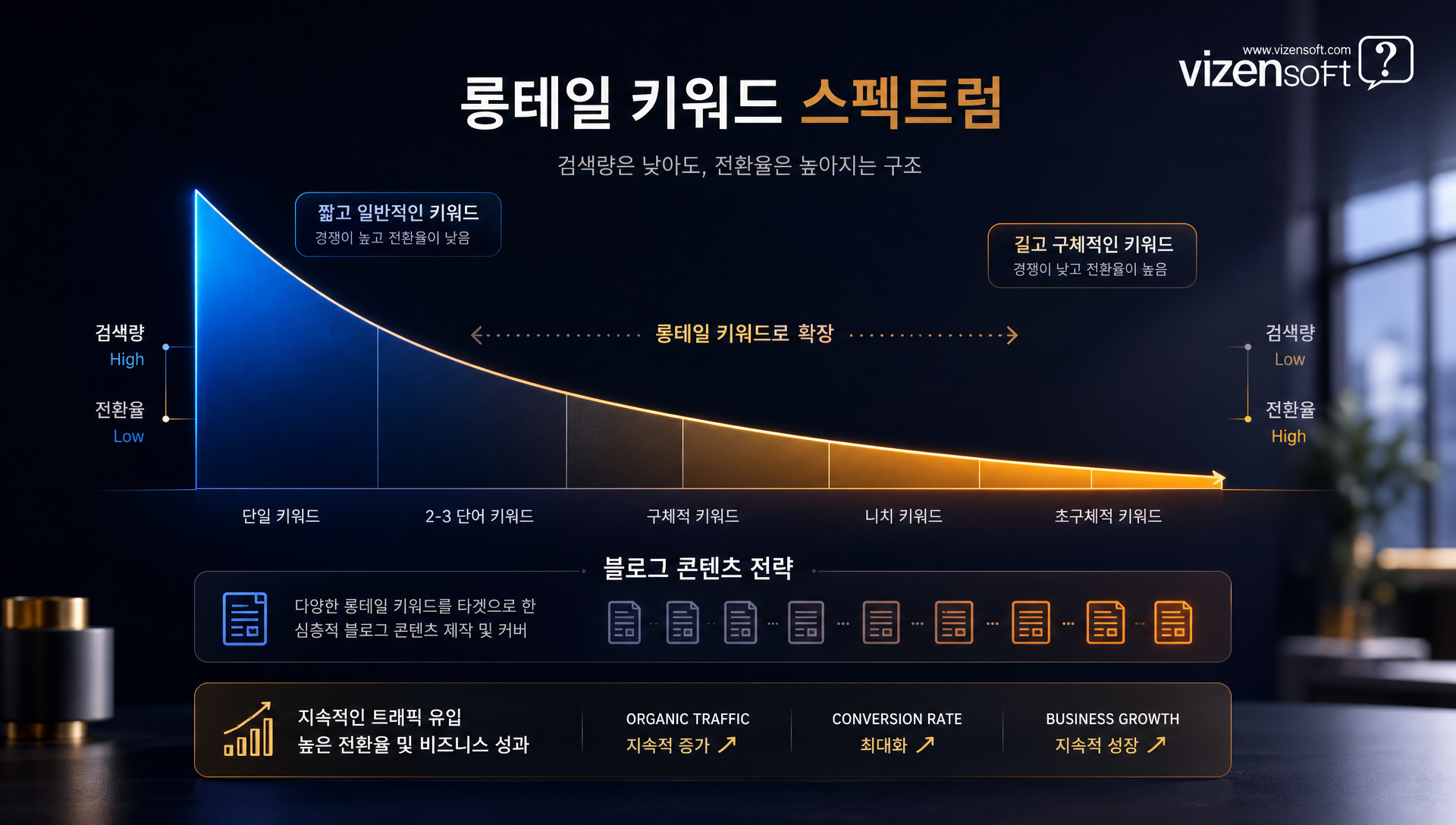 많은 기업들이 SEO를 생각할 때 "우리 회사 이름"이나 "우리 제품명"으로 검색될 때 1위에 오르는 것만 목표로 합니다. 물론 그것도 중요하지만, 사실 인터넷 검색의 70% 이상은 3단어 이상의 구체적인 롱테일 키워드(Long-tail Keyword)로 발생합니다. 이 롱테일 검색을 잡는 것이 실질적인 잠재 고객 유입으로 이어지는 핵심 전략입니다.