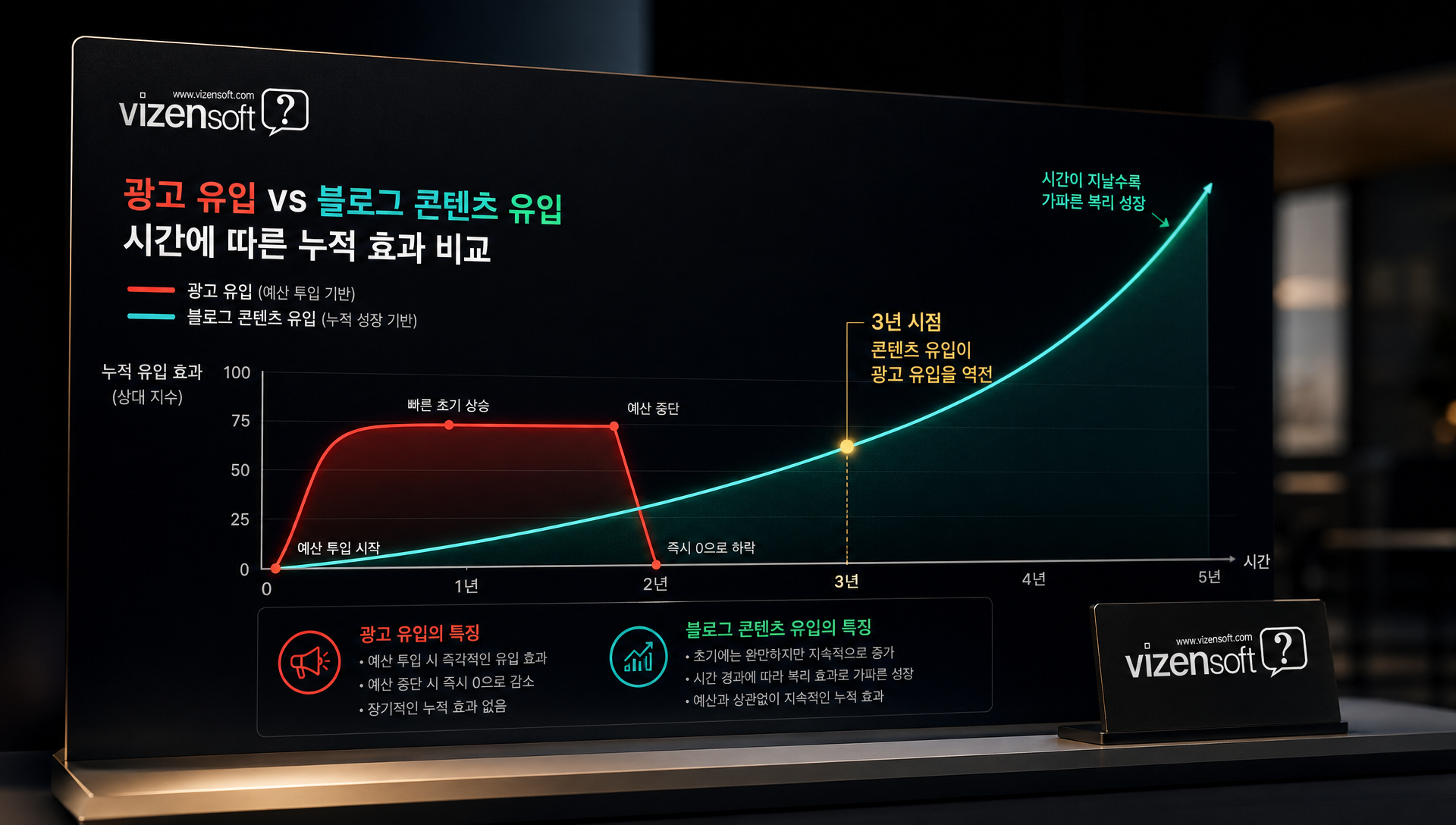 블로그는 또한 장기 유입 자산이라는 특성이 있습니다. 광고는 예산이 끊기는 순간 유입도 끊기지만, 잘 만들어진 블로그 글은 발행 후 1년, 2년, 심지어 3년이 지나도 꾸준히 검색 유입을 만들어냅니다. 콘텐츠가 누적될수록 유입이 늘어나는 복리 구조, 이것이 광고와 블로그의 가장 결정적인 차이입니다.
