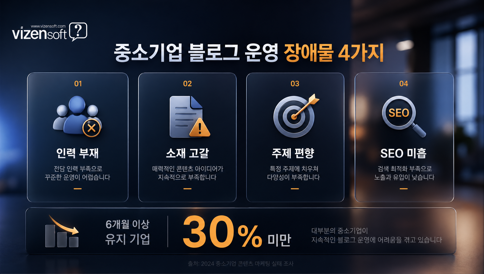 블로그의 SEO 효과가 이렇게 명확함에도 불구하고, 많은 중소기업들이 홈페이지 블로그 운영을 시작하지 못하거나 시작해도 금세 방치하는 이유는 뭘까요? 비젠소프트가 수백 개의 기업 홈페이지를 운영하며 파악한 현실적인 장애물들을 솔직하게 이야기해 드리겠습니다.