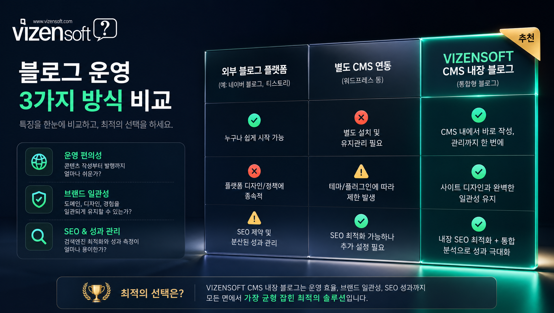 | 구분 | 외부 블로그 플랫폼 활용 | 별도 CMS 연동 방식 | CMS 내장 블로그 (비젠소프트) |