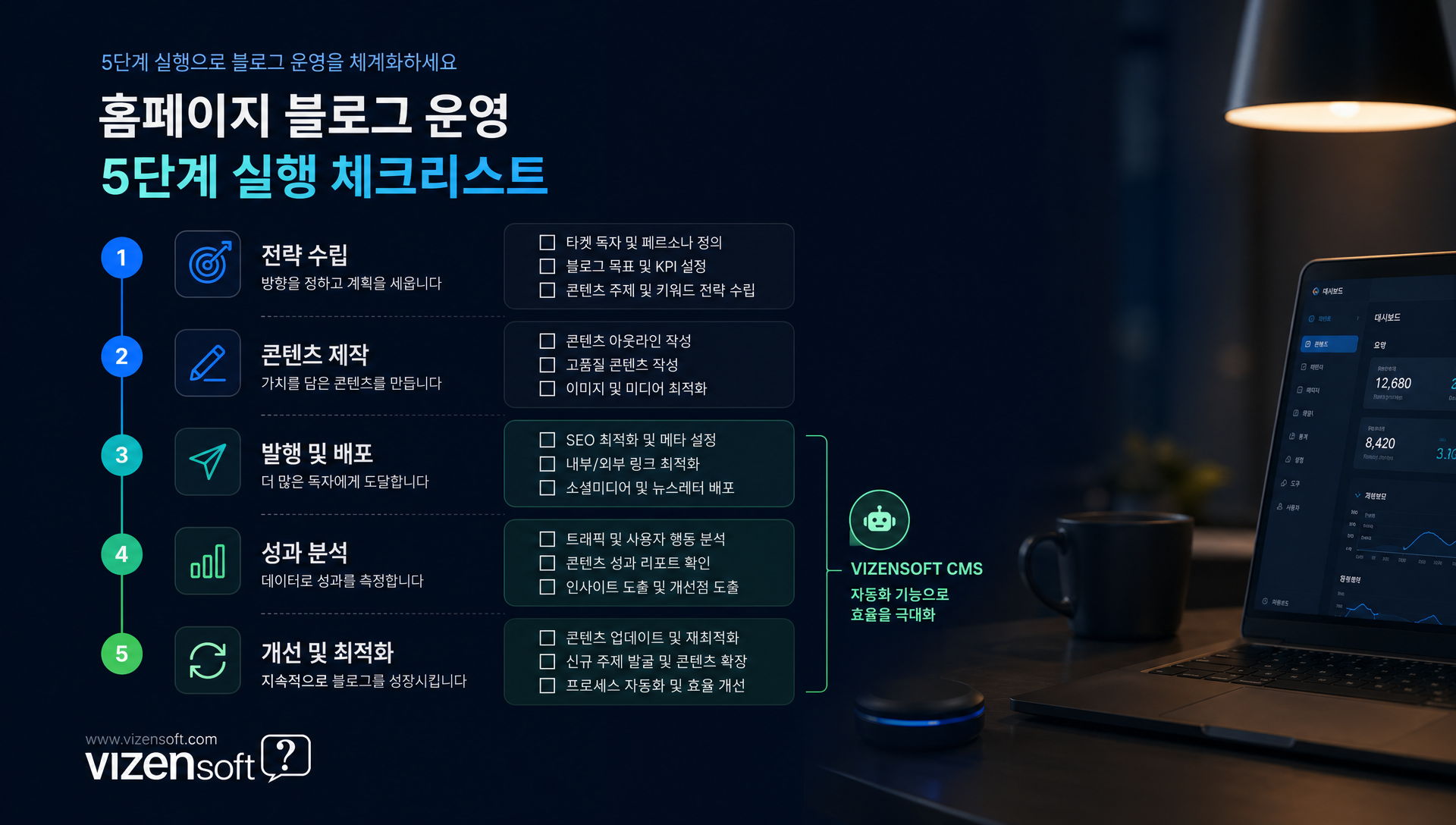 블로그 운영을 결심했다면, 어떻게 시작하고 지속할 것인지에 대한 실행 가이드가 필요합니다. 비젠소프트 CMS를 기준으로 단계별로 정리해 드립니다.