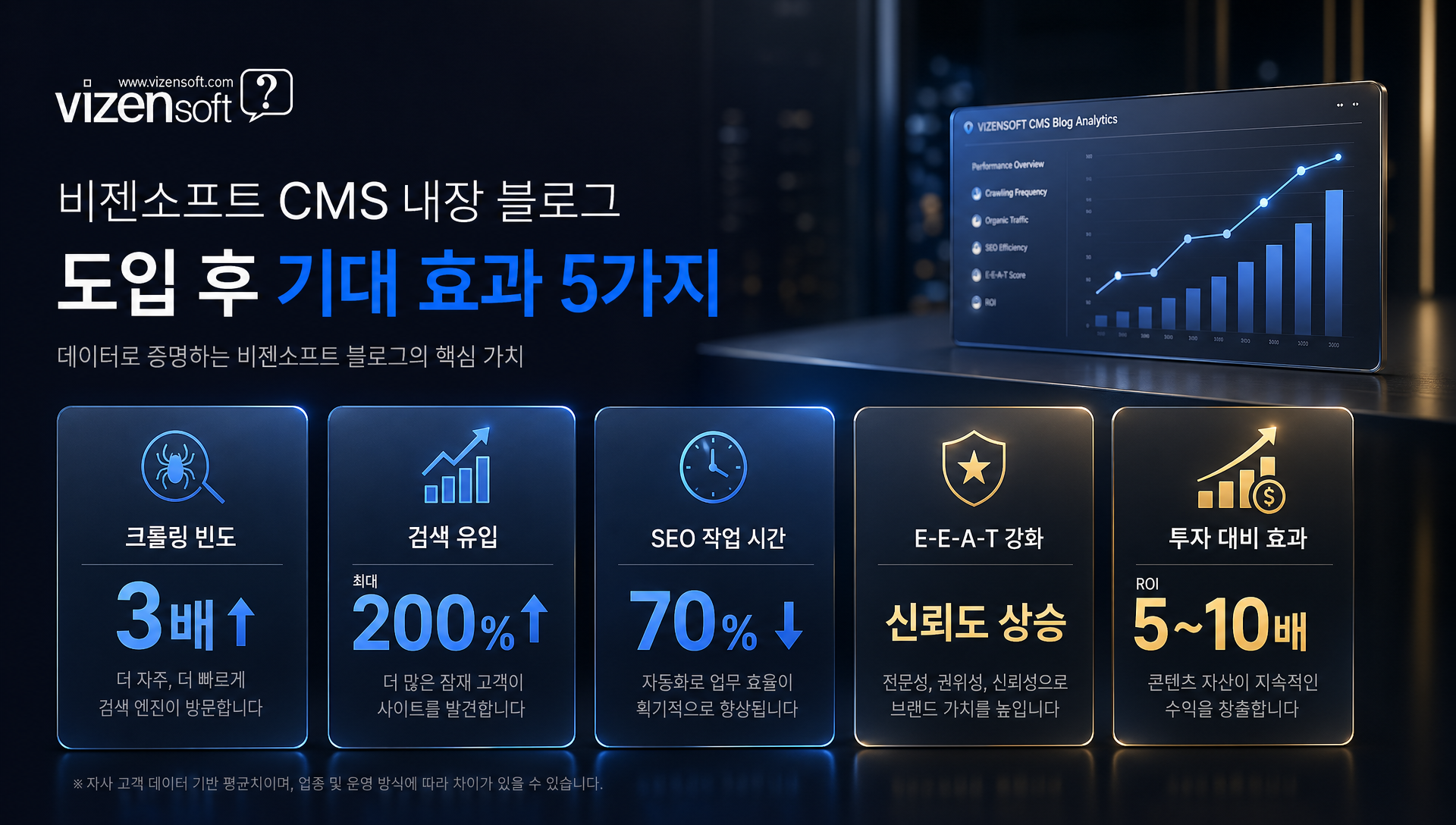 비젠소프트 CMS의 내장 블로그와 SEO 자동화 기능을 도입했을 때 기대할 수 있는 구체적인 효과를 정리합니다.