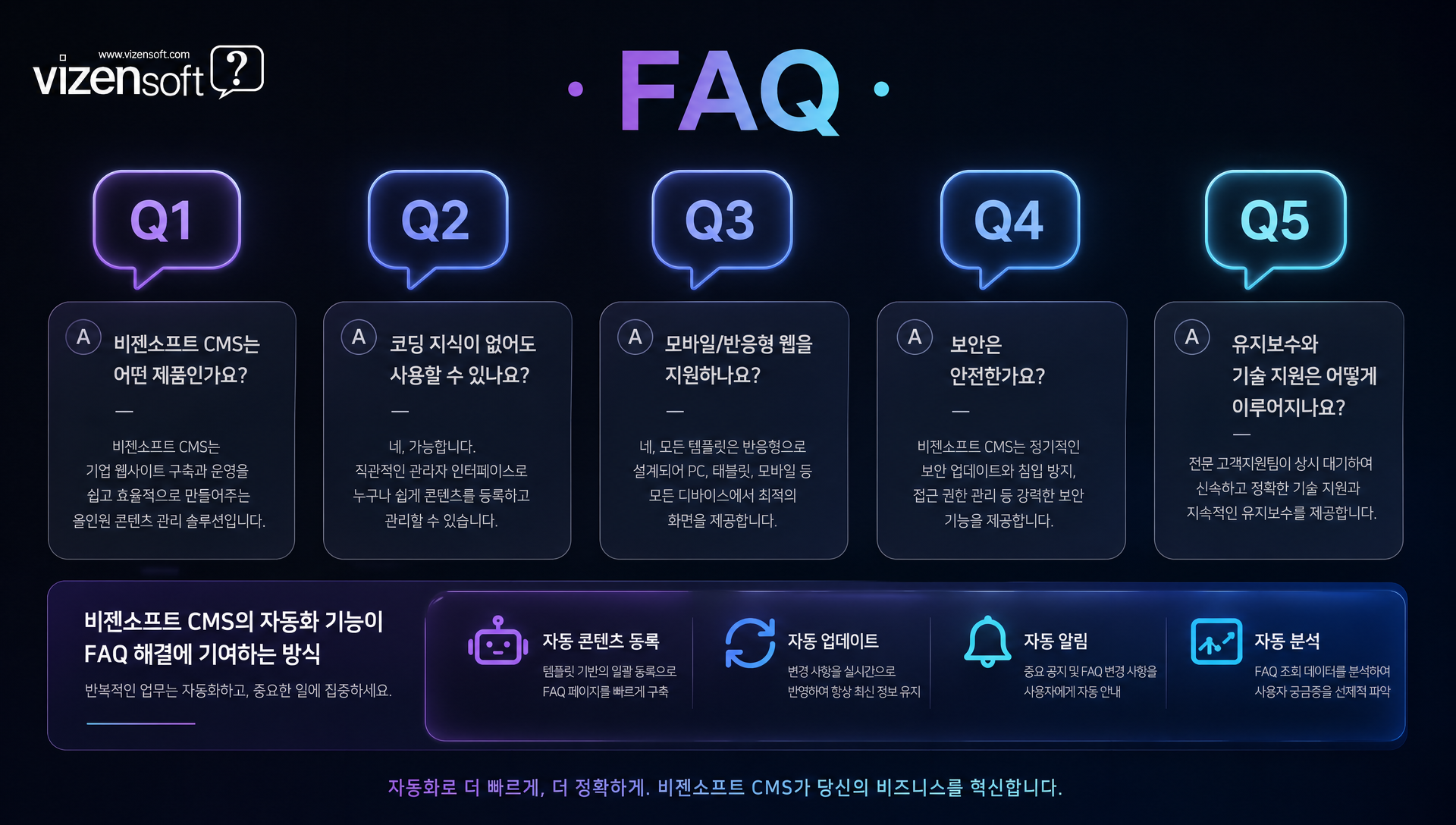 이 네 가지 장애물 때문에, 블로그 운영을 시작한 기업들 중 6개월 이상 꾸준히 유지하는 비율이 전체의 30%가 채 되지 않는다는 조사 결과도 있습니다. 문제는 "운영해야 한다"는 것을 알면서도 지속할 수 없다는 구조적 한계에 있습니다. 그리고 이 문제를 해결하는 것이 바로 비젠소프트가 CMS 솔루션 개발에 집중해온 방향입니다.
