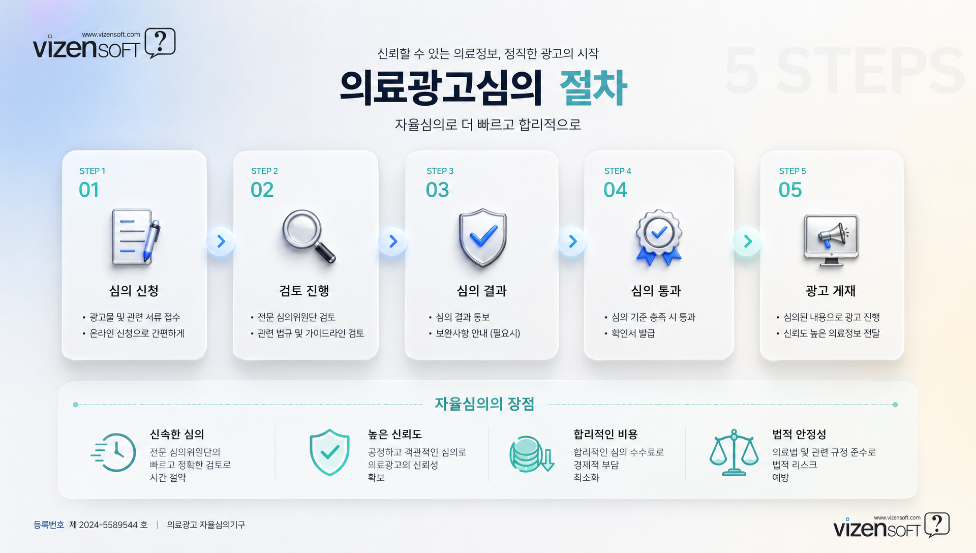 홈페이지에 포함될 콘텐츠 전체를 의료광고심의 기준에 맞게 검토합니다. 필요 시 관련 의료 단체의 자율 심의를 신청하거나, 의료법 전문가의 검토를 받습니다.