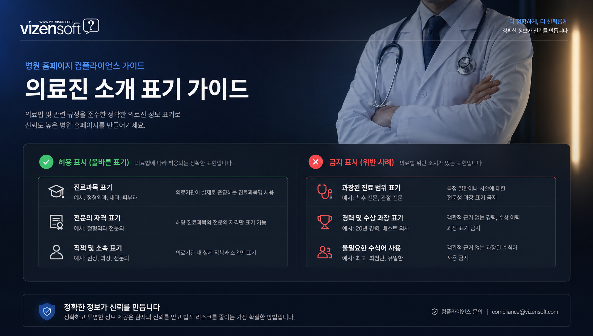 홈페이지의 의료진 소개 페이지는 사실에 기반한 정보만을 명확하게 표기해야 합니다. 안전하게 포함할 수 있는 항목은 다음과 같습니다.