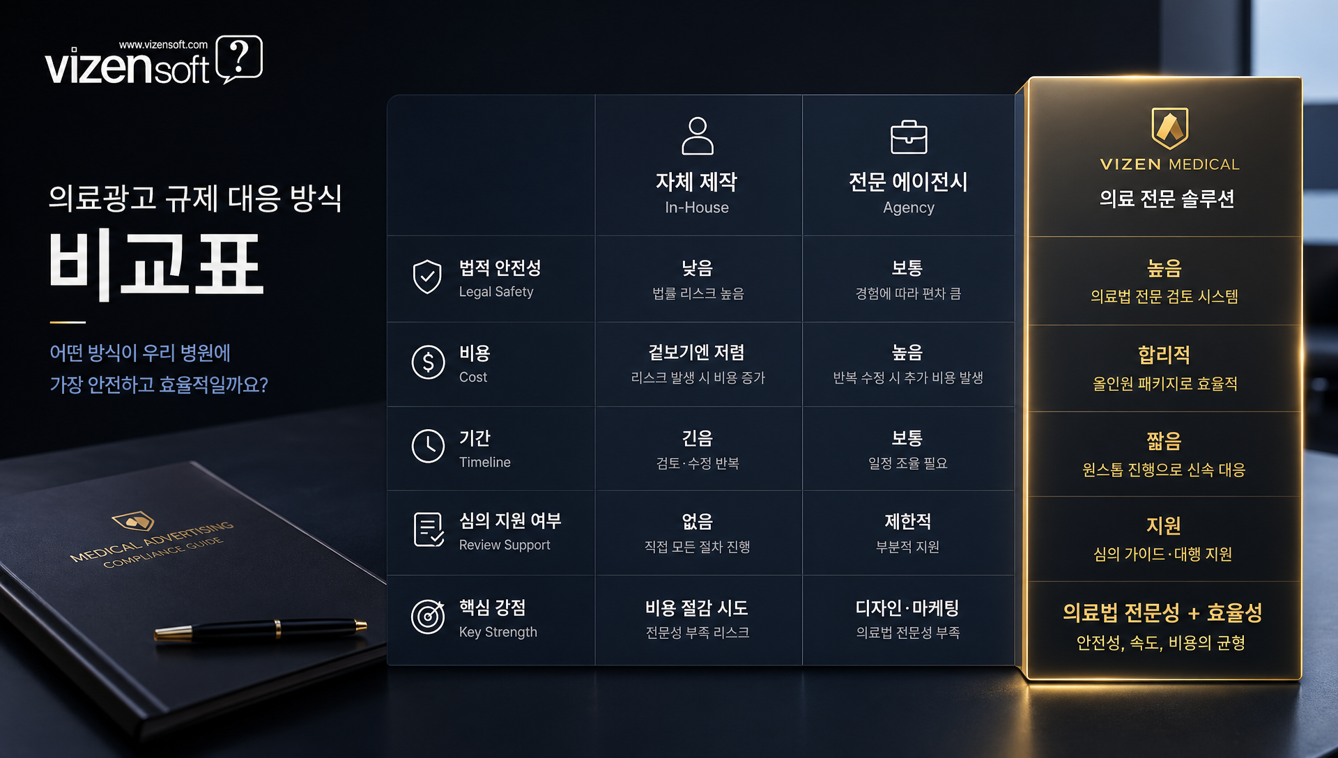 | 구분 | 일반 웹 제작사 | 임대형 솔루션(DIY) | 의료 전문 솔루션(비젠메디컬) |
