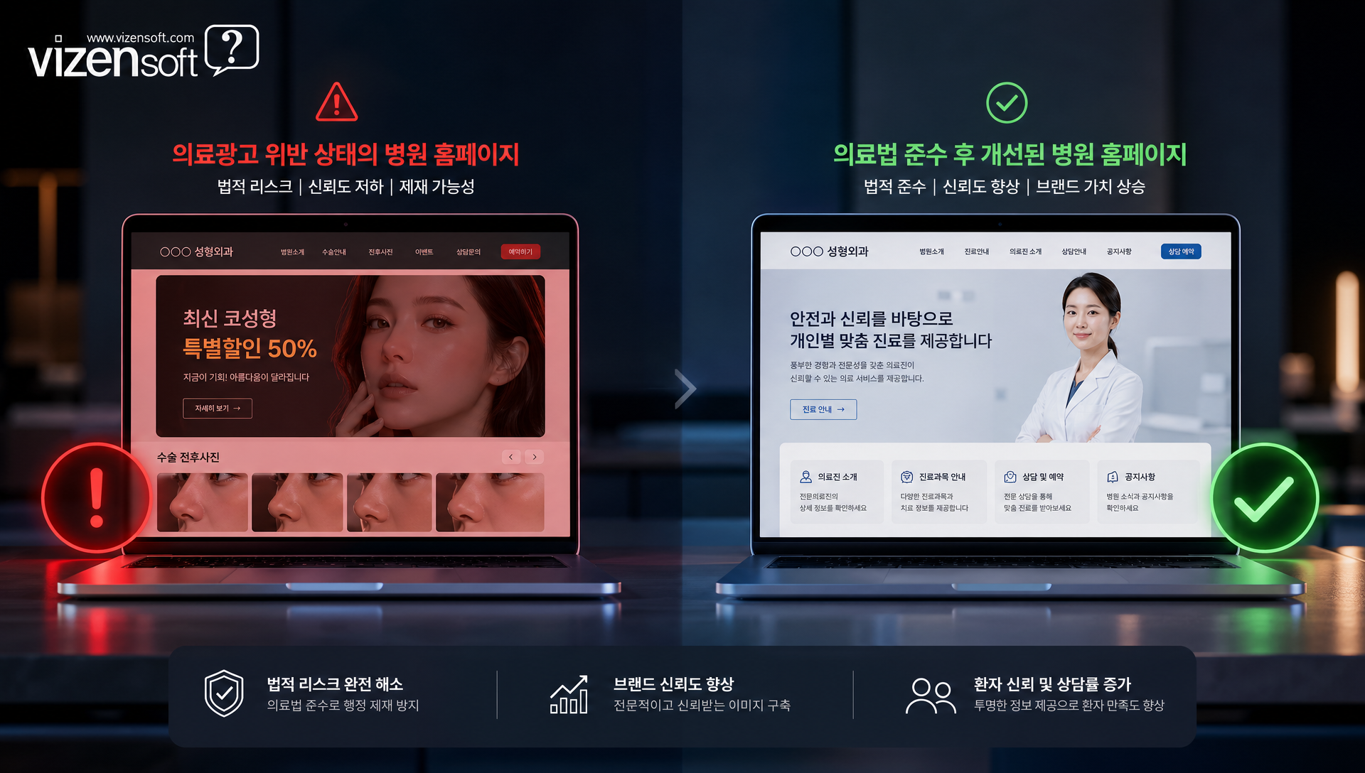 병원홈페이지 제작 전, 의료법 위반 피하는 5가지 체크리스트 - "우리 병원 홈페이지 이제 다 만들었어요! 디자인도 예쁘고 진료 항목도 잘 정리했습니다."