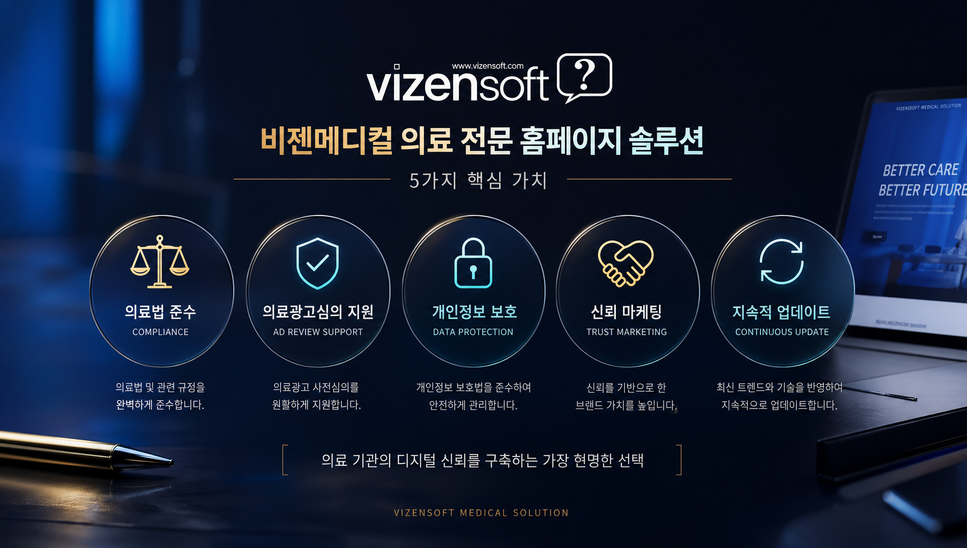 비젠메디컬은 비젠소프트의 의료 전문 웹 솔루션으로, 의료법준수와 병원마케팅 효과를 동시에 실현할 수 있도록 설계된 전문 서비스입니다. 의료광고심의 기준에 맞는 콘텐츠 가이드라인, 의료기관 맞춤형 개인정보 처리방침, 지속적인 법령 업데이트 지원까지 — 병원홈페이지가 완성된 이후에도 안전하게 운영될 수 있도록 함께합니다.