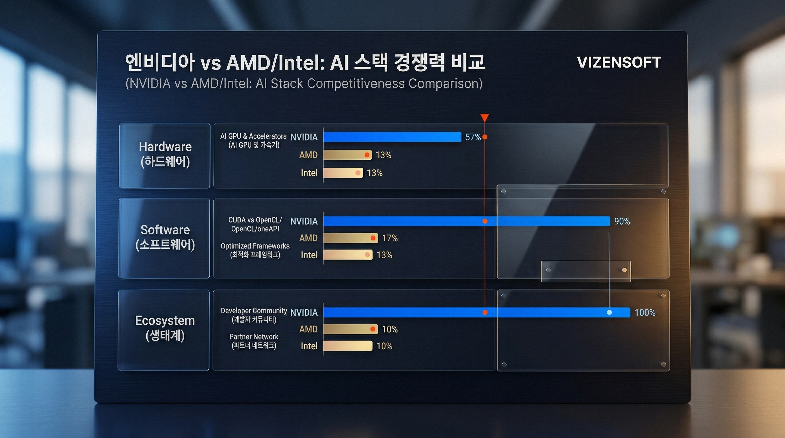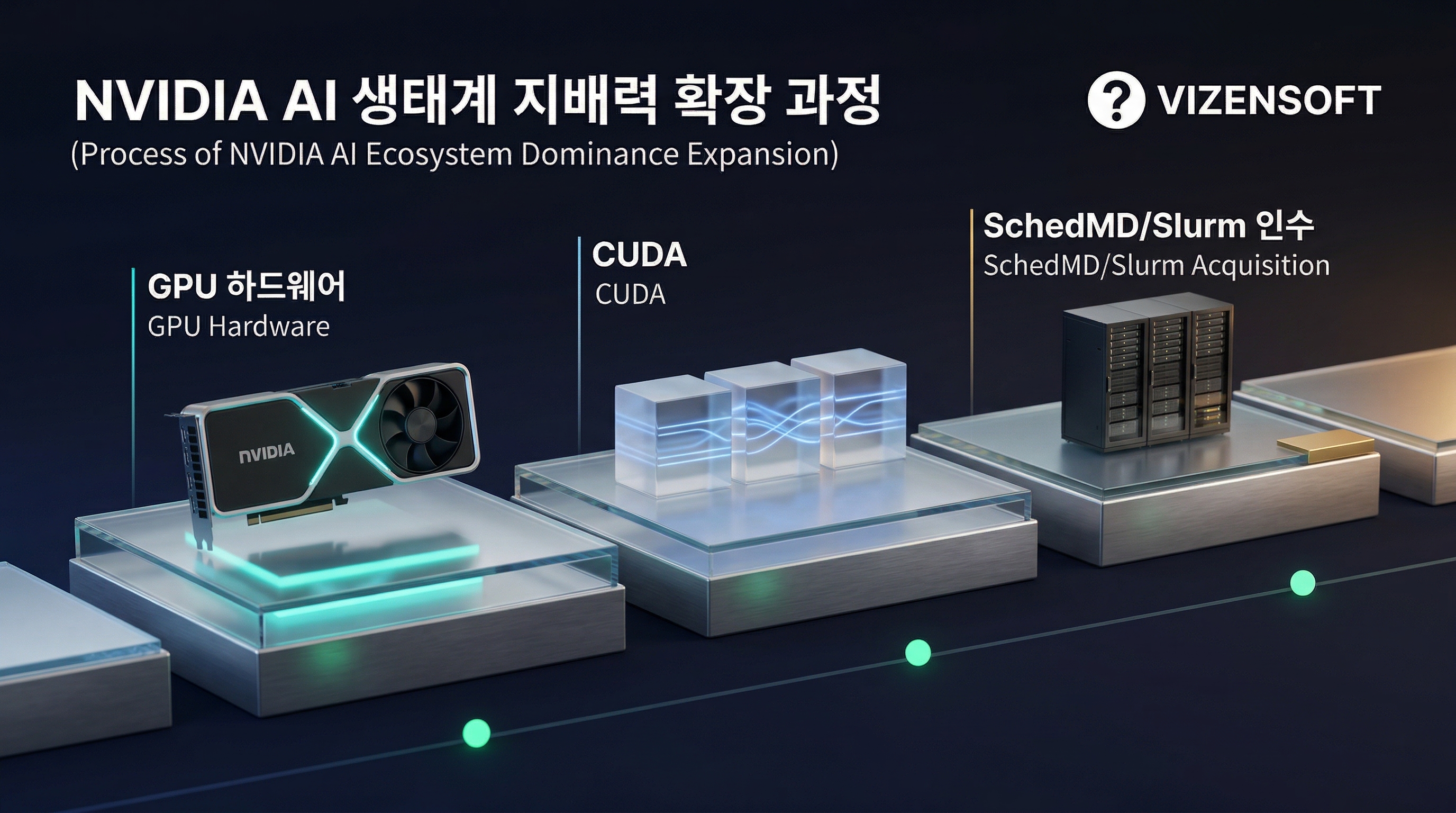 - 하드웨어: GPU 시장 80% 점유율 (H100, A100) - 개발 플랫폼: CUDA 생태계 독점 - 인프라 소프트웨어: Slurm 통제권 확보
