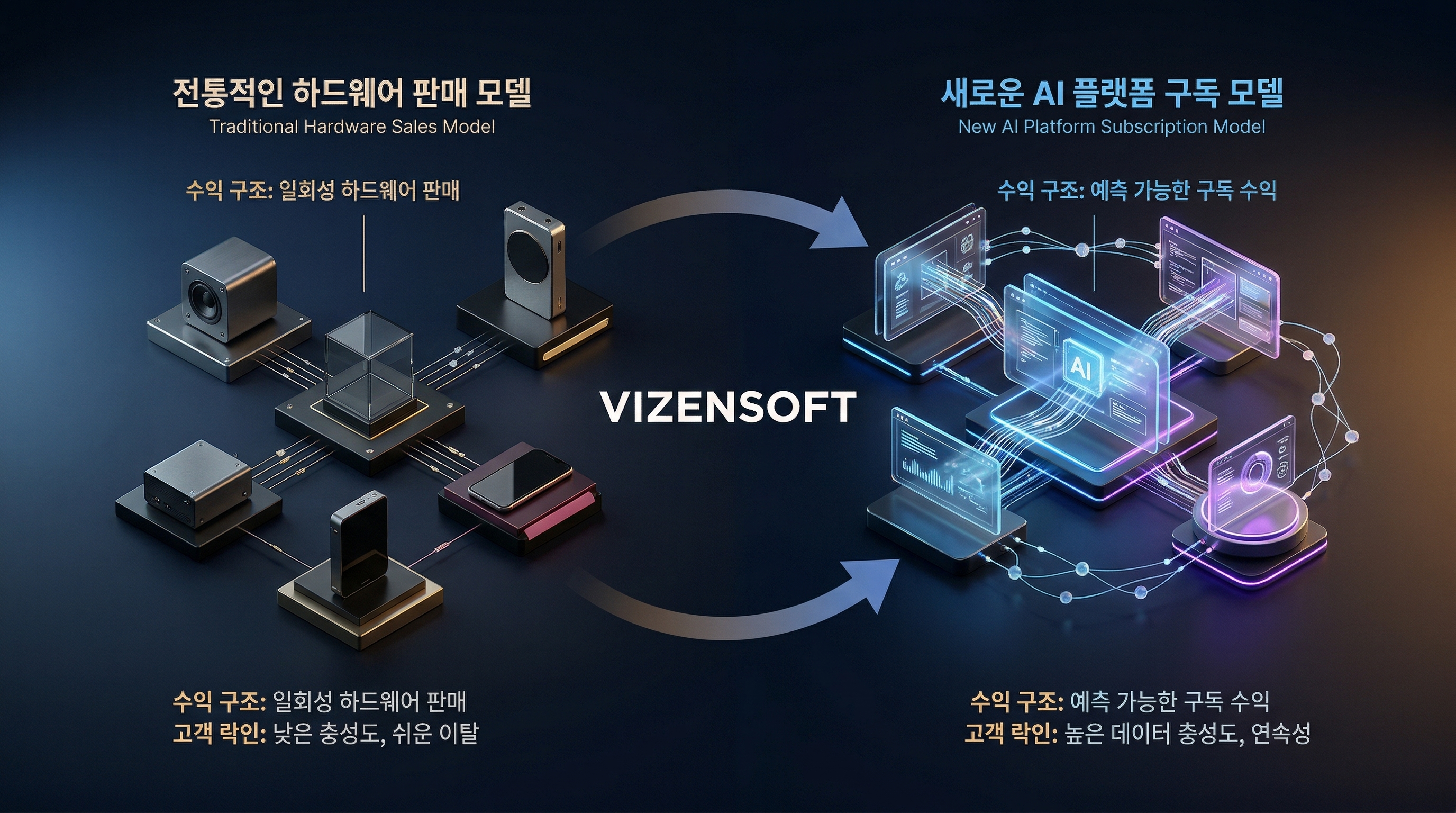 - 하드웨어 판매 → AI 인프라 구독 서비스 - 일회성 매출 → 지속적 수익 모델 - 제조업 → 플랫폼 비즈니스