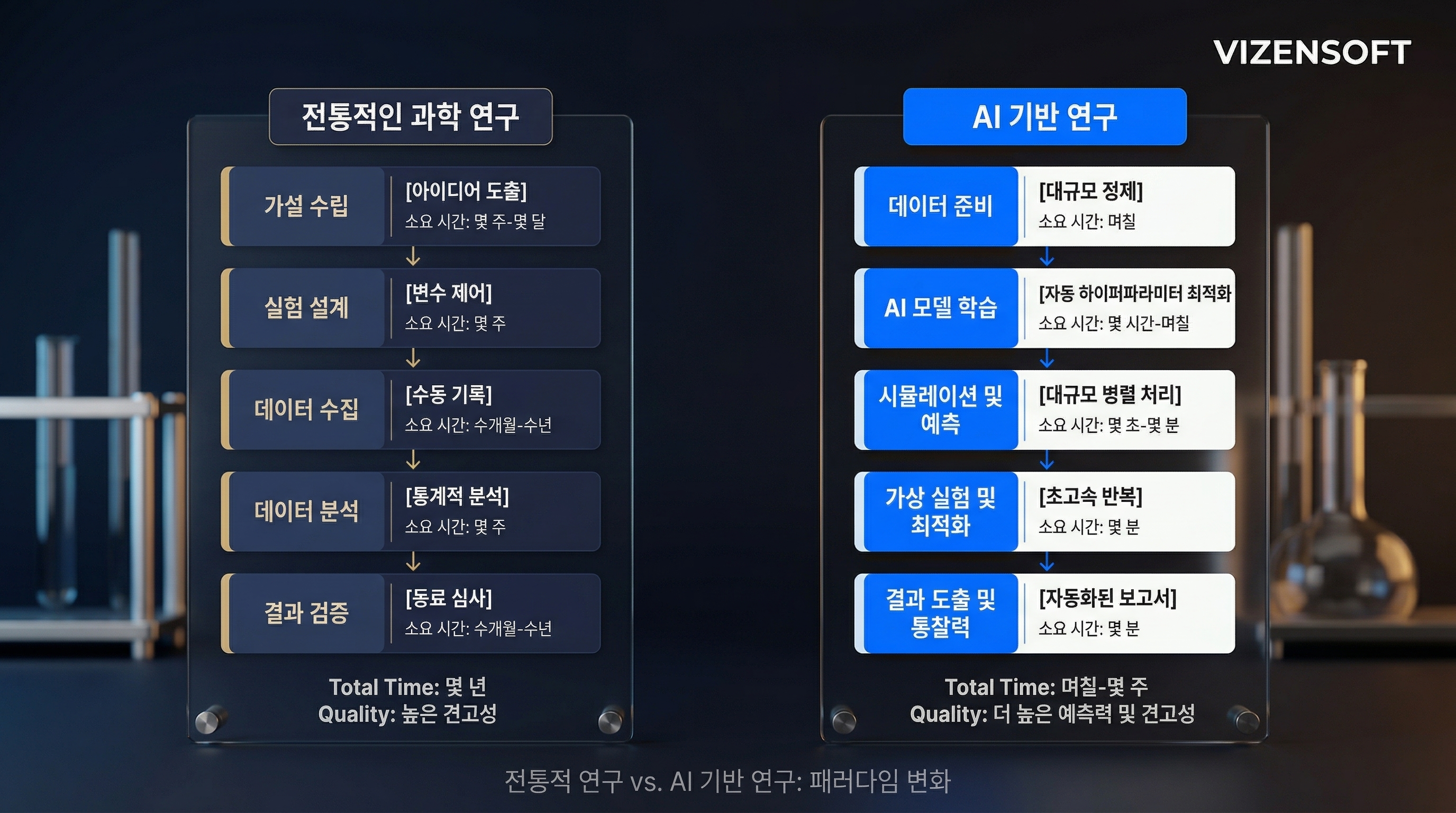 이 뉴스가 중요한 이유는 AI가 과학 연구의 본질을 바꾸고 있기 때문이다. 전통적으로 과학 발전은 가설 설정, 실험 검증, 동료 평가를 거친 논문 발표의 순환 구조로 이뤄졌다. 하지만 AI는 이 구조의 각 단계를 압축하거나 생략하며 새로운 패러다임을 만들고 있다.