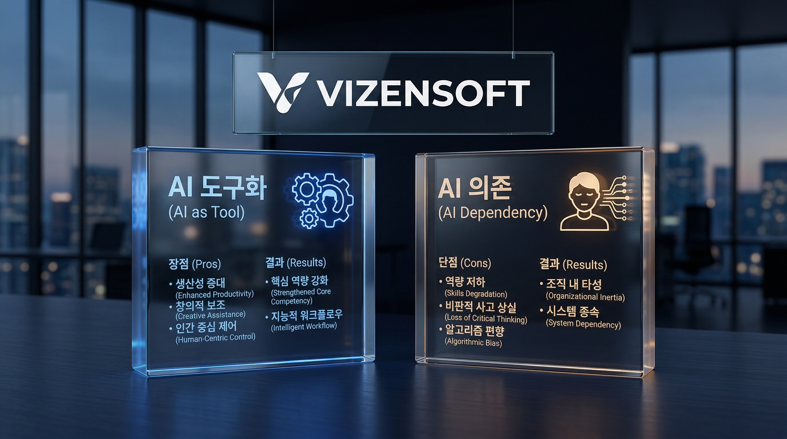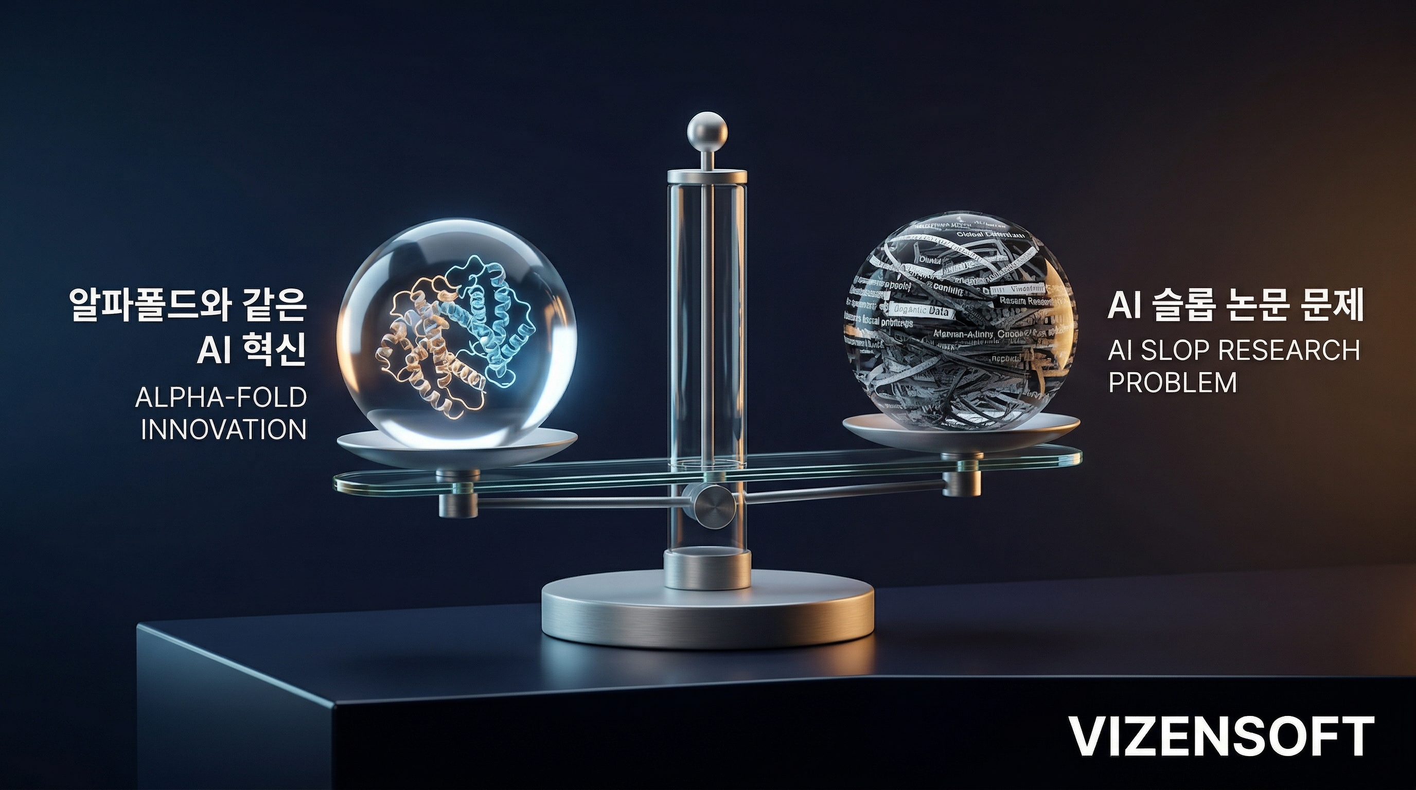 비젠소프트는 이 현상을 'AI 도구화'와 'AI 의존'의 경계선 문제로 분석한다. 알파폴드처럼 인간의 한계를 보완하고 새로운 발견을 가능케 하는 AI는 도구로서 가치가 크다. 하지만 사고 과정을 대체하는 논문 생성 AI는 창의성과 비판적 사고를 퇴화시킬 위험이 있다.
