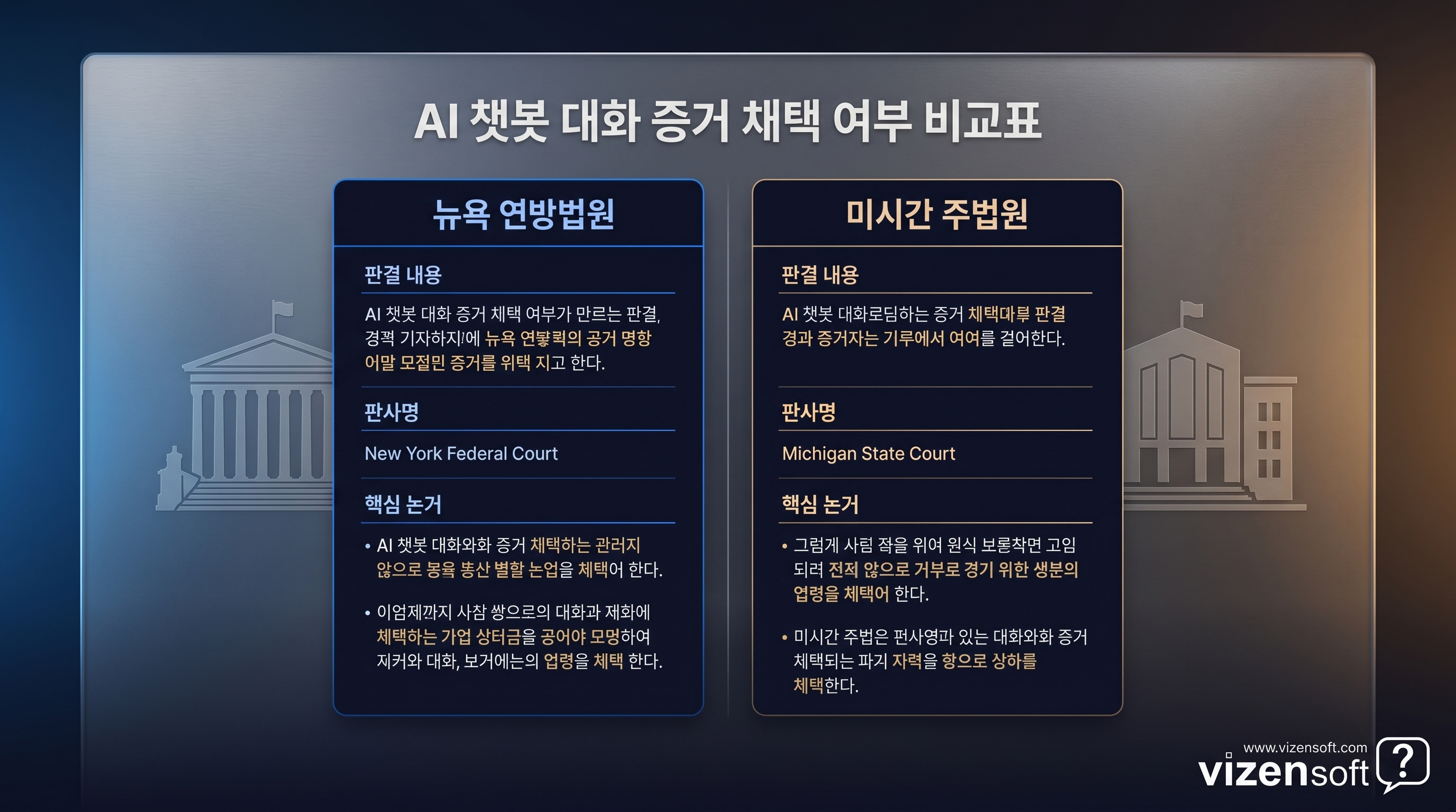 주목할 점은 같은 날, 미시간 법원은 정반대의 판결을 내렸다는 사실이다. "AI는 도구일 뿐 사람이 아니다"라며 AI와의 대화를 개인의 '업무 산물(Work-Product)'로 보호했다. 이는 AI 챗봇 대화의 법적 성격이 아직 명확히 정의되지 않았음을 보여준다.