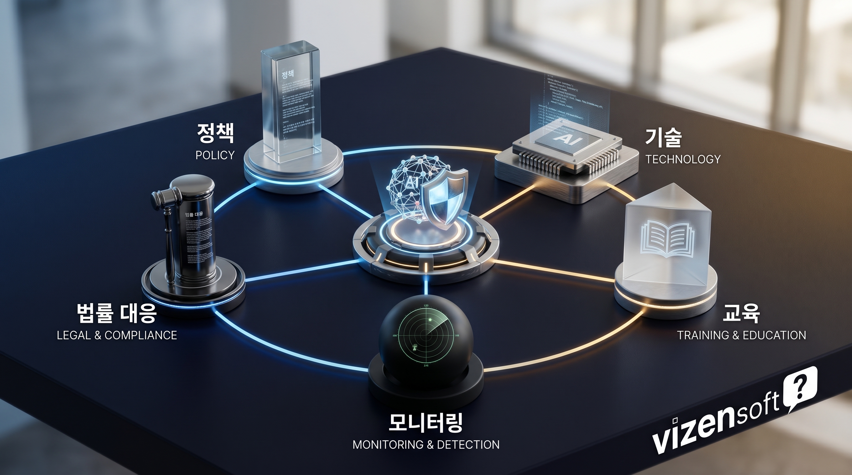 공개 AI 서비스 접근 권한을 직군별로 세분화하고, 민감 정보 입력 여부를 모니터링하는 AI 거버넌스 체계 구축이 시급하다. 온프레미스 또는 프라이빗 클라우드 기반 AI 환경 전환을 중장기 로드맵에 포함해야 한다.