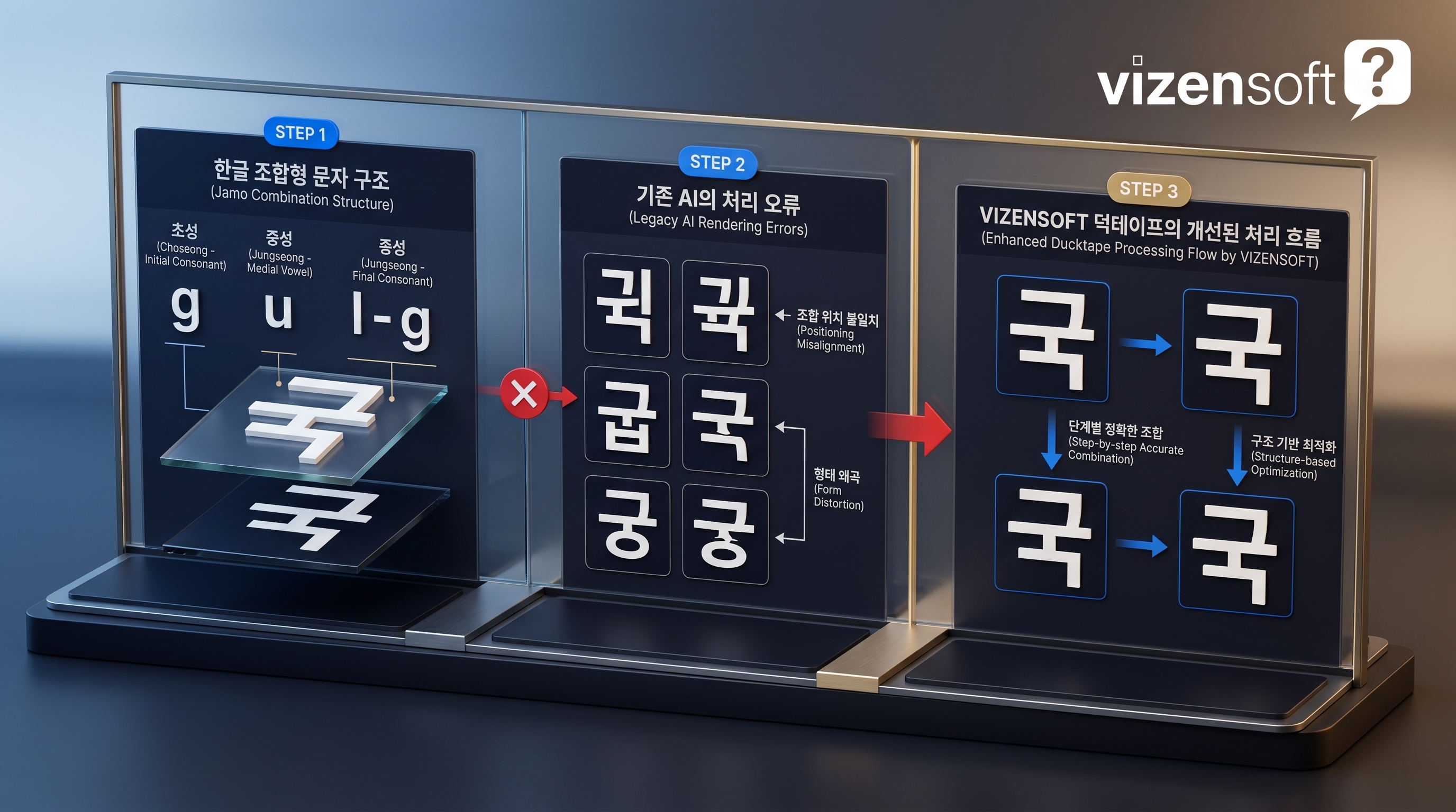 한글 렌더링은 단순한 기술 과제가 아니다. 이미지 생성 AI에서 한글 처리가 어려운 근본적인 이유는 구조적이다. 영어와 달리 한글은 초성·중성·종성의 조합형 문자 체계를 갖기 때문에, 픽셀 기반으로 이미지를 생성하는 AI 모델이 글자의 형태를 정확히 예측하고 재현하는 것이 본질적으로 어렵다. 대부분의 글로벌 이미지 생성 AI가 영어권 중심 학습 데이터를 기반으로 설계된 것도 이 문제를 심화시켜 왔다.